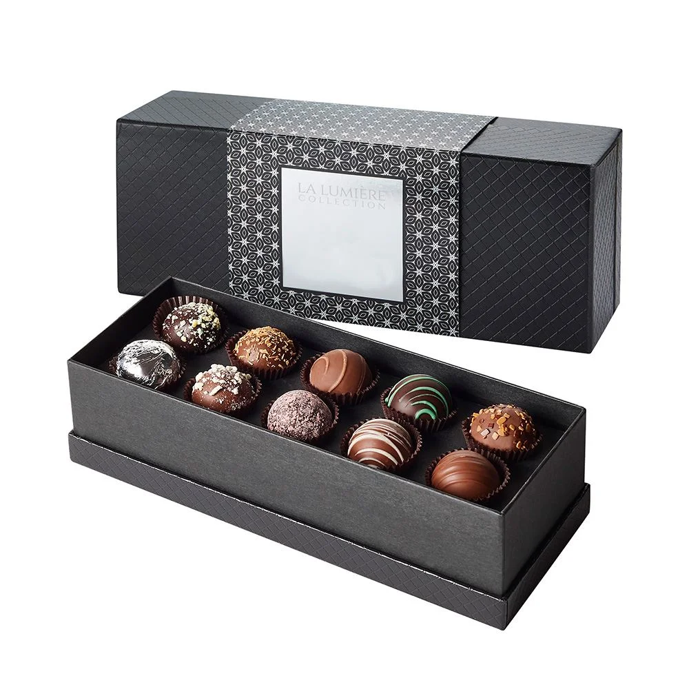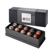 Milk choc. tiramisu, milk choc. coffee, dark choc. champagne, dark choc. Irish creme, dark choc. amaretto, dark choc. black forest, dark choc. mint, milk choc. rum, dark choc., milk choc. toasted coconut
