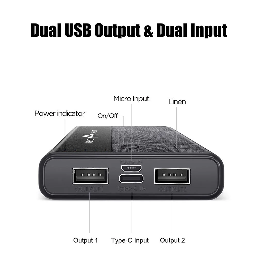 Recharge the power bank with your own Type C or Micro-USB cables