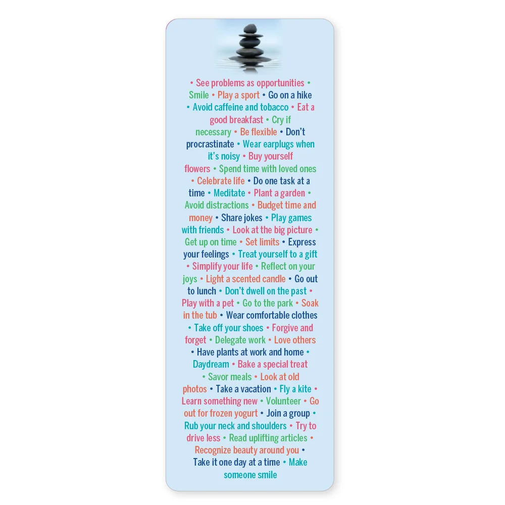 Offers 101 relaxing activities, including: Visualize a relaxing scene; Stay clutter-free; Laugh often; Exercise; Set realistic goals; Simplify your life, and more