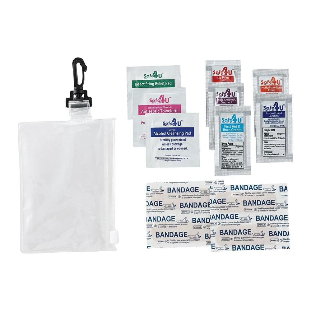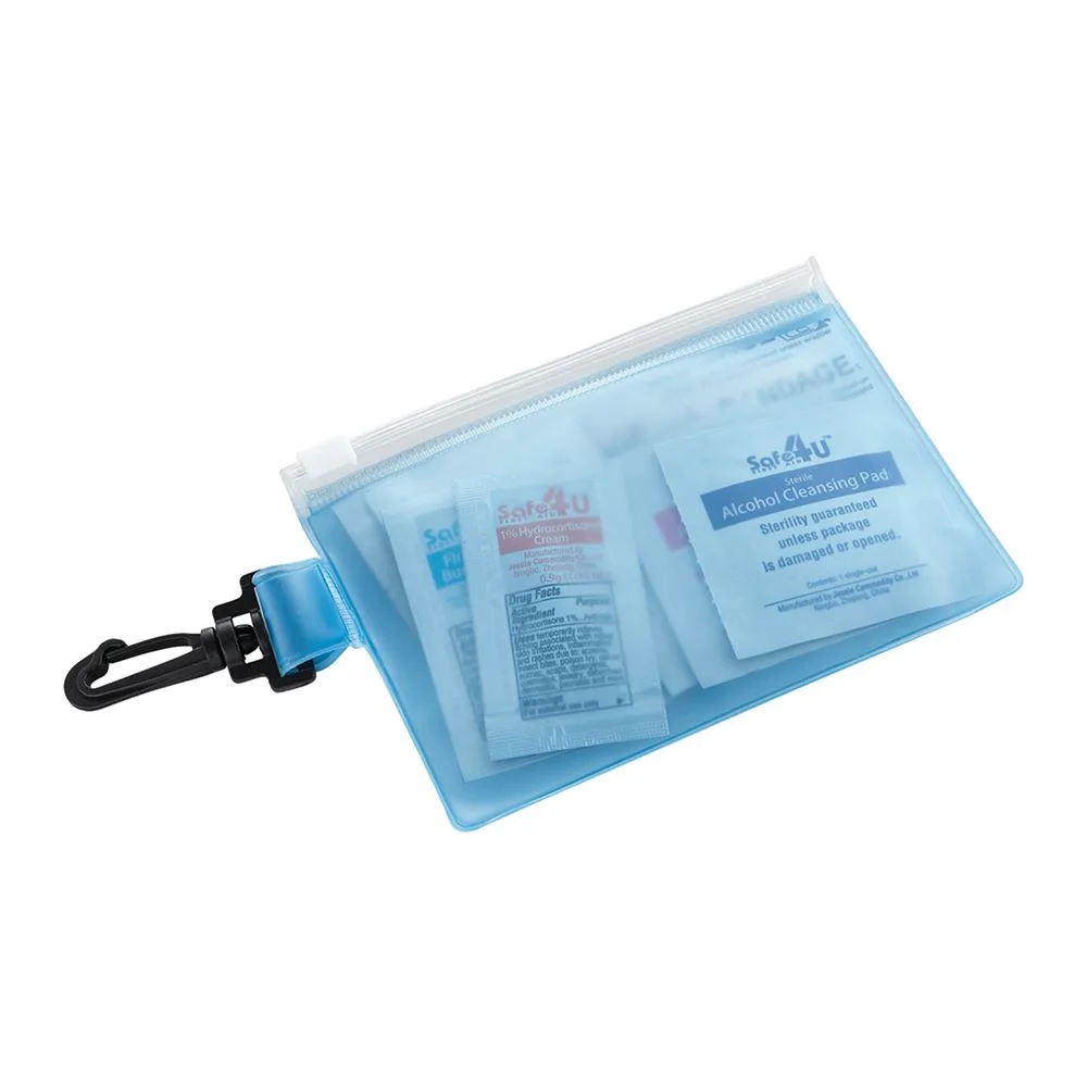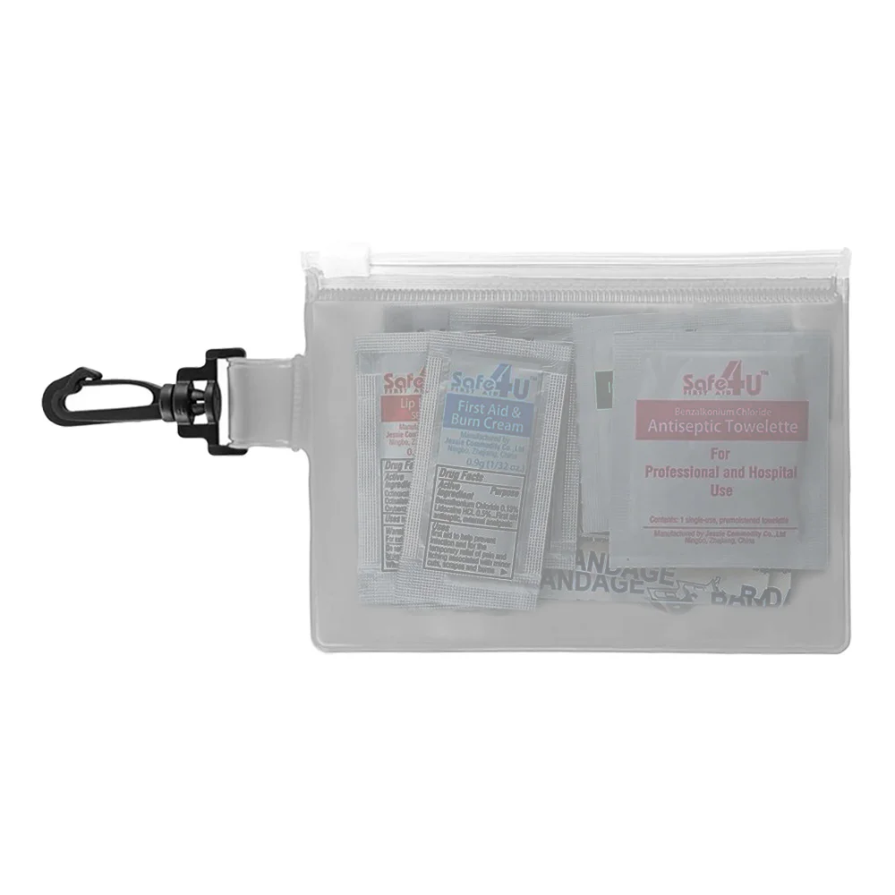 Travel-sized first-aid kit in a PVC pouch with a plastic zip closure