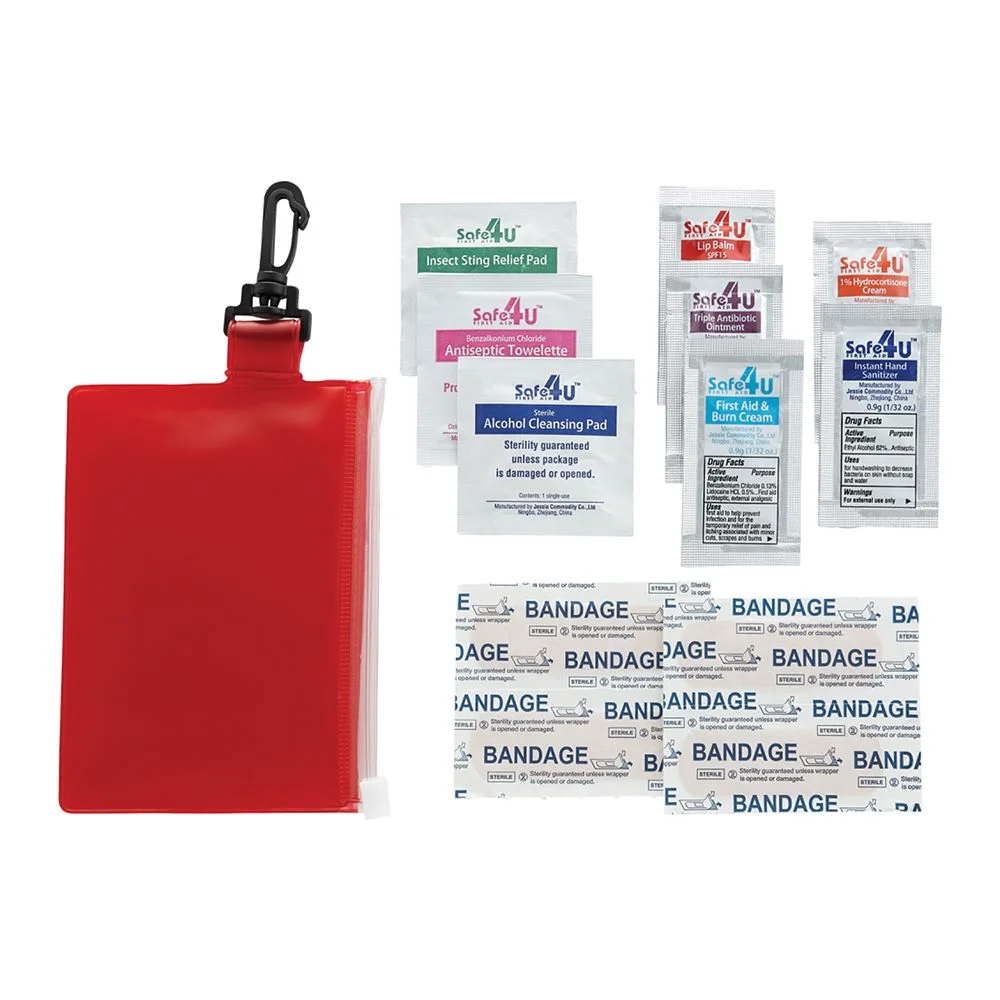 Includes four adhesive bandages, one alcohol cleansing wipe, one antiseptic wipe, one insect sting relief wipe, SPF-15 lip balm, first-aid burn cream, 1% hydrocortisone cream, triple antibiotic ointment, and instant hand sanitizer in single-use packets