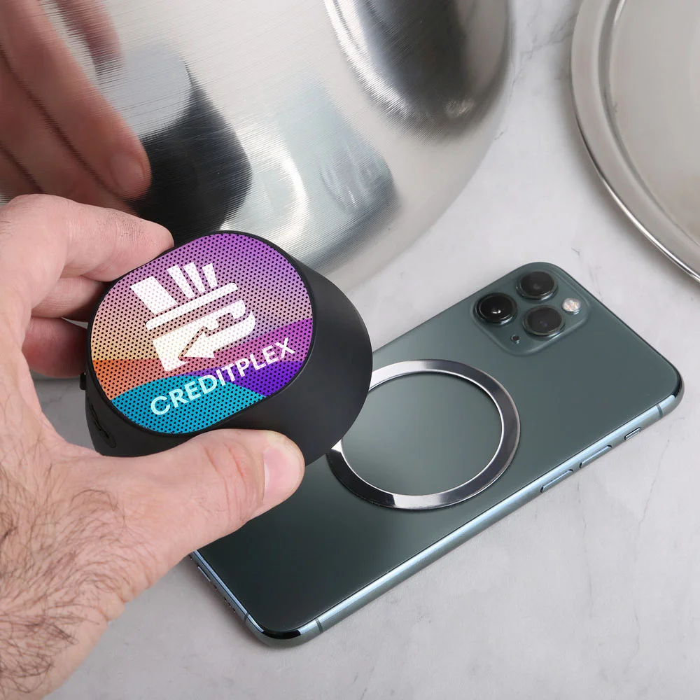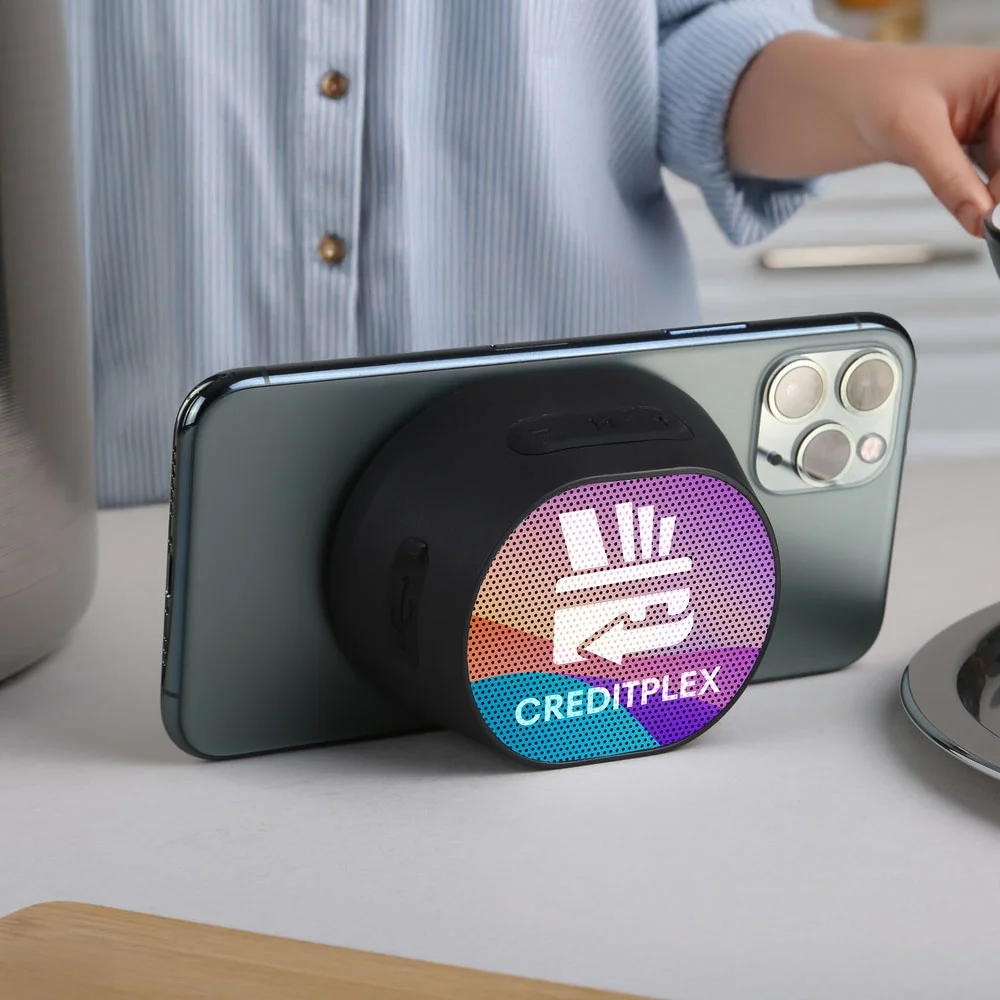 The Audio Anchor, 5W Wireless Speaker doubles as a magnetic stand, effortlessly attaching to the back of your phone for hands-free entertainment