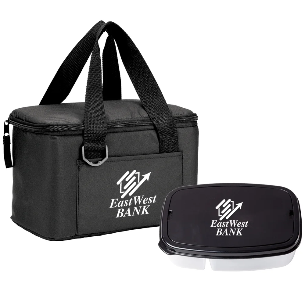 2-piece gift set includes: 2-Section Food Container With Utensils & Chill Box 6-Can Insulated rPET Lunch/Cooler Bag