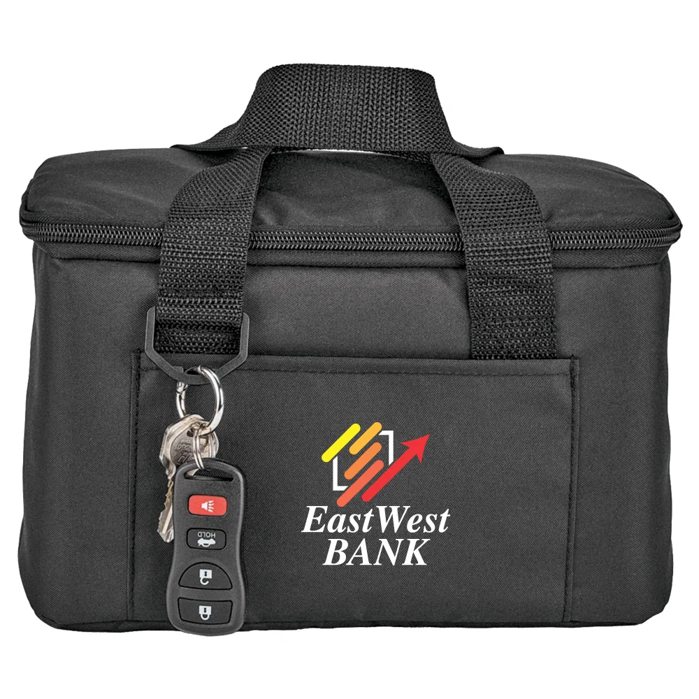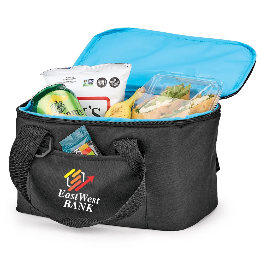 Personalized 6-Can Cooler: Insulated, leak-resistant compartment ideal for carrying meals, snacks, and beverages; Holds up to 6 cans with ice; Flip-top, zip-around lid for easy access; Front slip pocket for napkins and quick-grab items; Easy-carry reinforced handles; D-ring for keys; ID window on back; Made of 300-denier recycled polyester (rPET); Easy-clean, bright blue lining; PEVA foam insulation