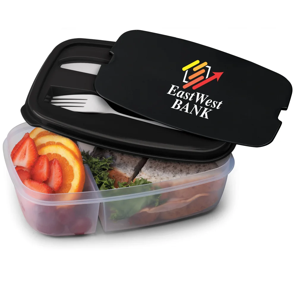 Personalized Food Container: Sturdy, food-safe plastic food container with two separate compartments; Tight-fitting compartment lid snaps open to reveal included plastic fork and knife built in beneath protective cover; Fits in most lunch bags; Microwave, freezer, and dishwasher safe; Eco friendly; Reusable; BPA free; Note: Do not use with foods with high sugar or fat content