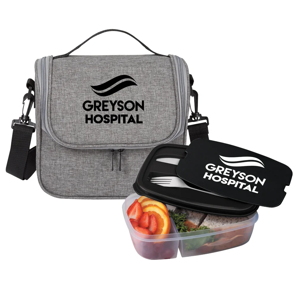 2-piece gift set includes: 2-Section Food Container With Utensils & Portland Lunch/Cooler Bag