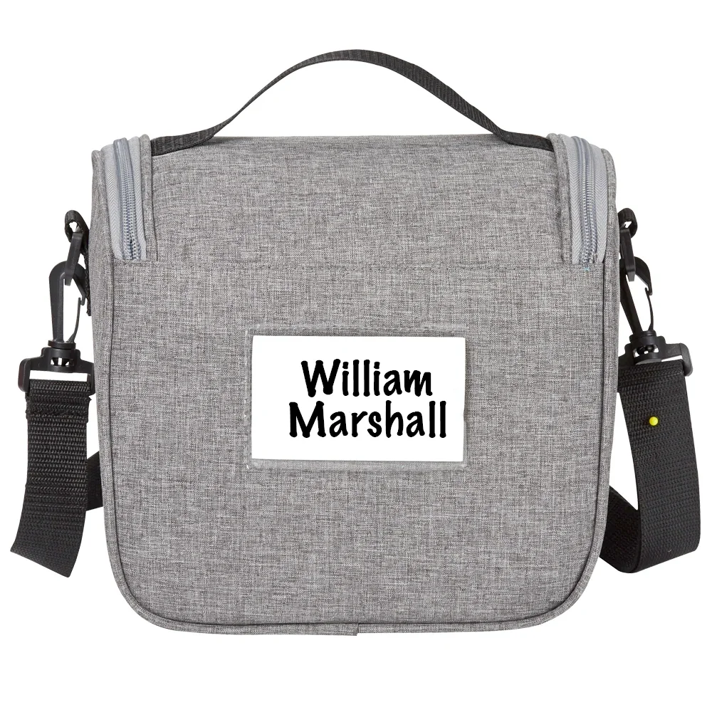Personalized Lunch/Cooler Bag: Dual-zip, foam-insulated, leak-resistant compartment ideal for stacking containers or up to 6 cans with ice; Interior is easy to wipe clean in case of any spills; Fits most food containers for convenient meals on the go; Exterior slip pocket for napkins and quick-grab items; Heathered 300-denier material with bright-blue lining and PEVA foam insulation; Adjustable, removable strap for shoulder or crossbody carry; Top carry handle; ID window on the back
