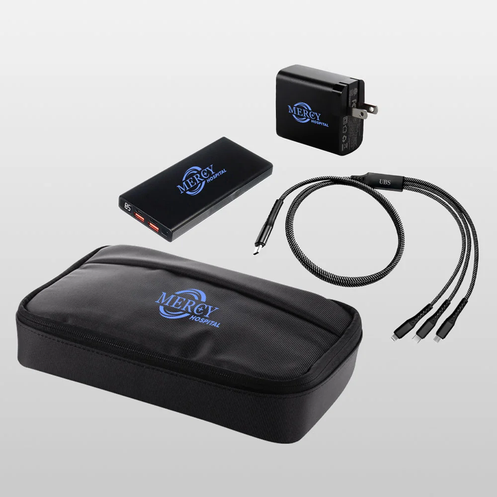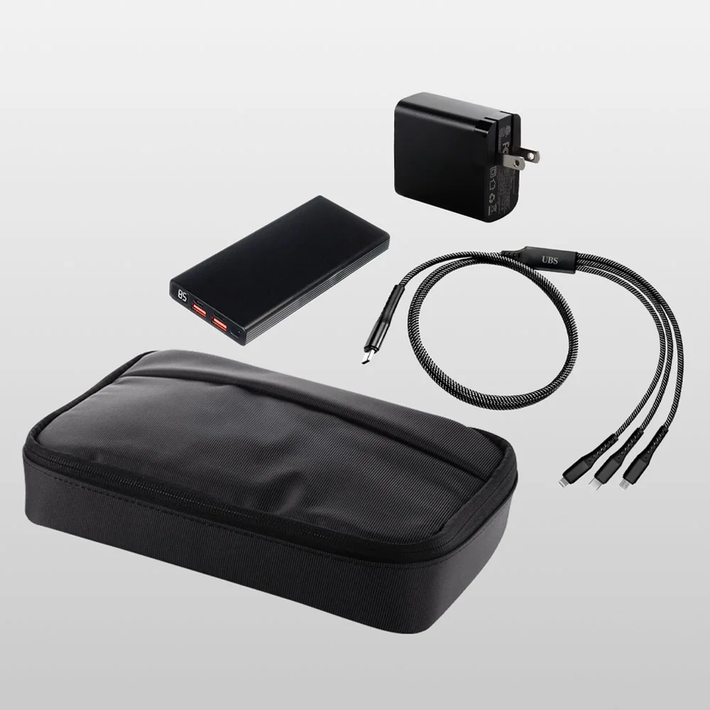 Features a quick-charging power bank, fast-charging wall adapter (with speeds for laptops and tablets), and a universal fast-charging cable