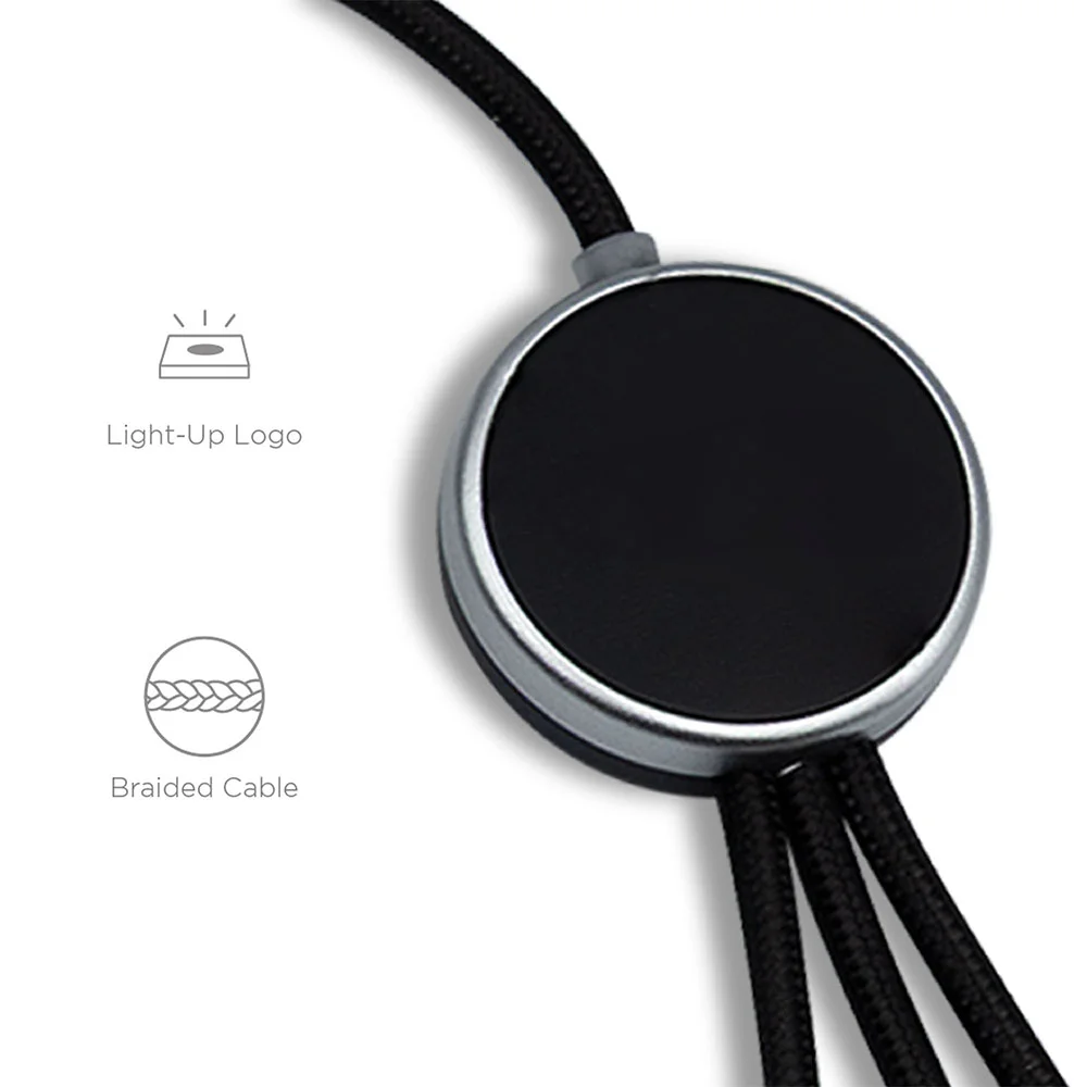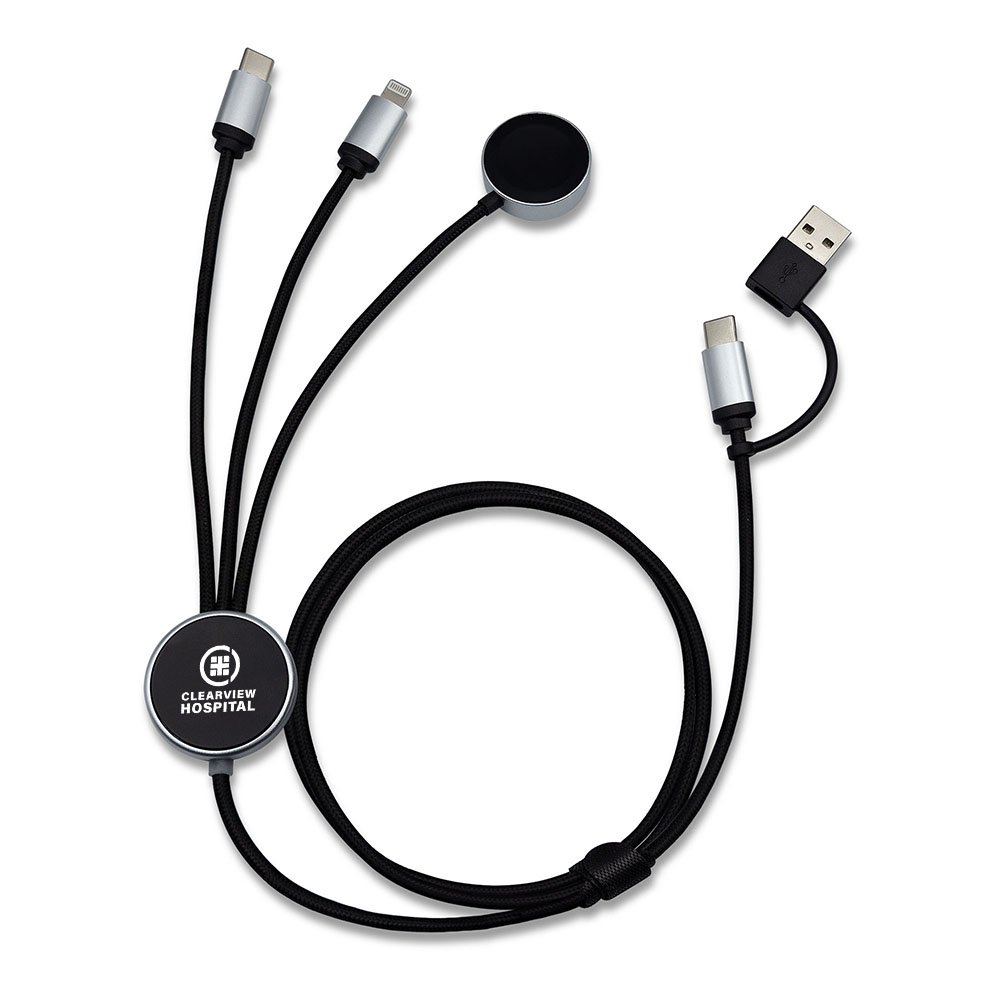 A premium 3-in-1 braided cable that combines Lightning and Type-C connectors with an Apple/Samsung Watch charging attachment into one seamless solution