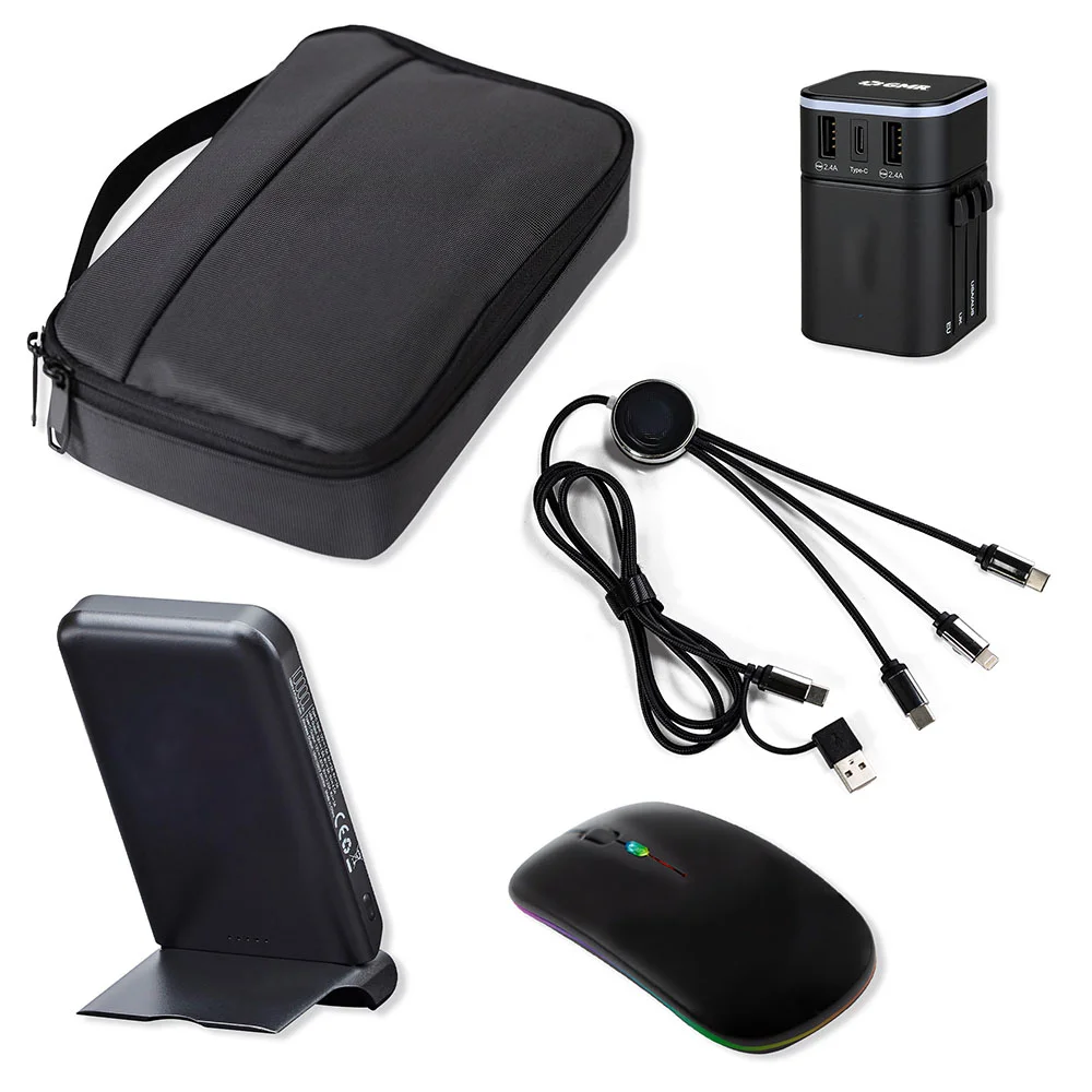 Powerbank: 2.25"H X 1.75"W, Adapter: 0625"H X 1.25"W, Charging Cable: 2.75" Dia., Mouse: 1.375"W X 0.625"H, Organizer: 5"W X 2"H, Up To 2 Lines/Logo; 25 Characters Max Per Line