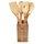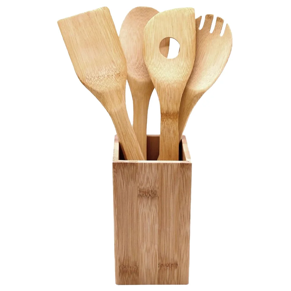 Set includes rounded fork, single hole mixing spoon, spatula, spoon, and holder