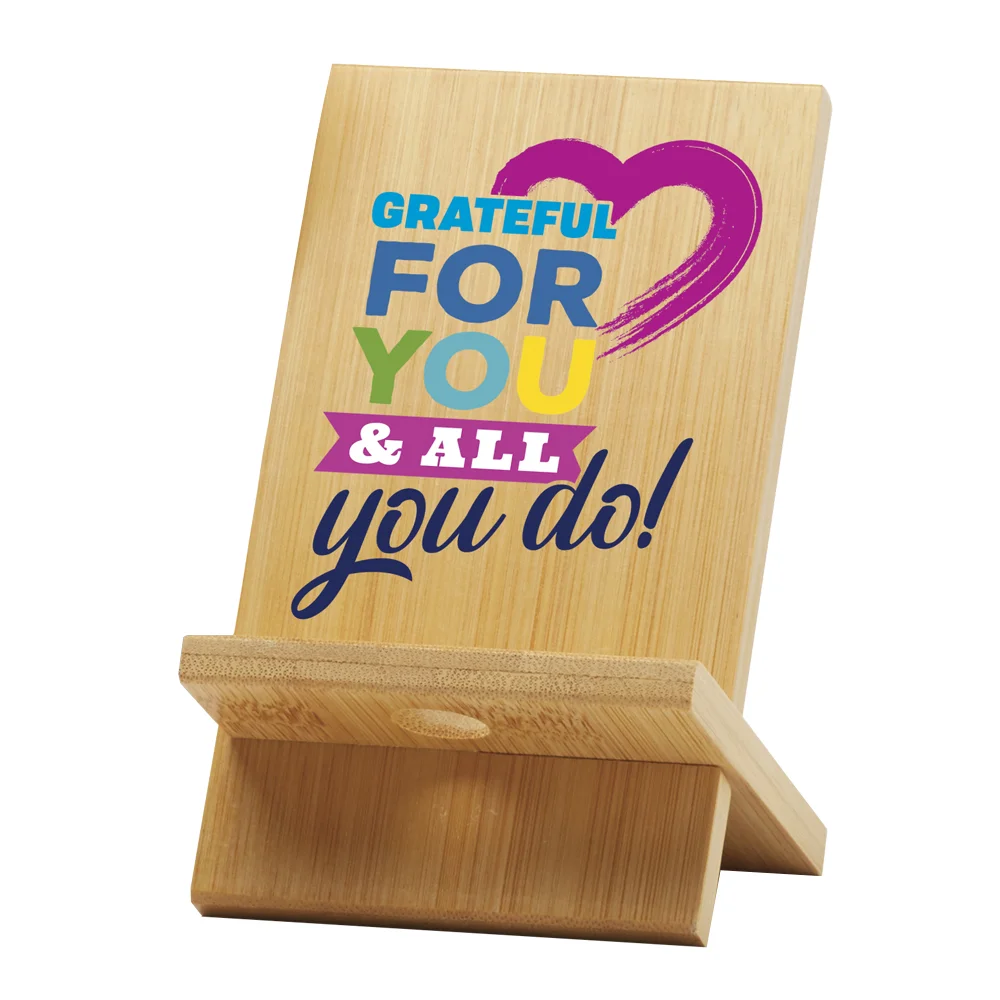 Bamboo Phone/Tablet Holder: Holds tablet, phone, or other device; Vertical or horizontal viewing angle; Made from natural, eco-friendly, renewable bamboo; Slot in base lets phone charge while in use