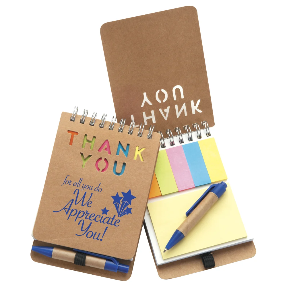 Eco-Jotter & Pen: Compact, convenient; Jot notes, reminders, and more; Spiral-bound memo pad holds 5 multi-colored sticky flag pads, a pad of yellow sticky notes, and 40 sheets of lined memo paper; Mini ballpoint pen in elastic pen loop; Eco friendly; Recycled materials; Eco-brown recycled paper cover with die-cut Thank You design