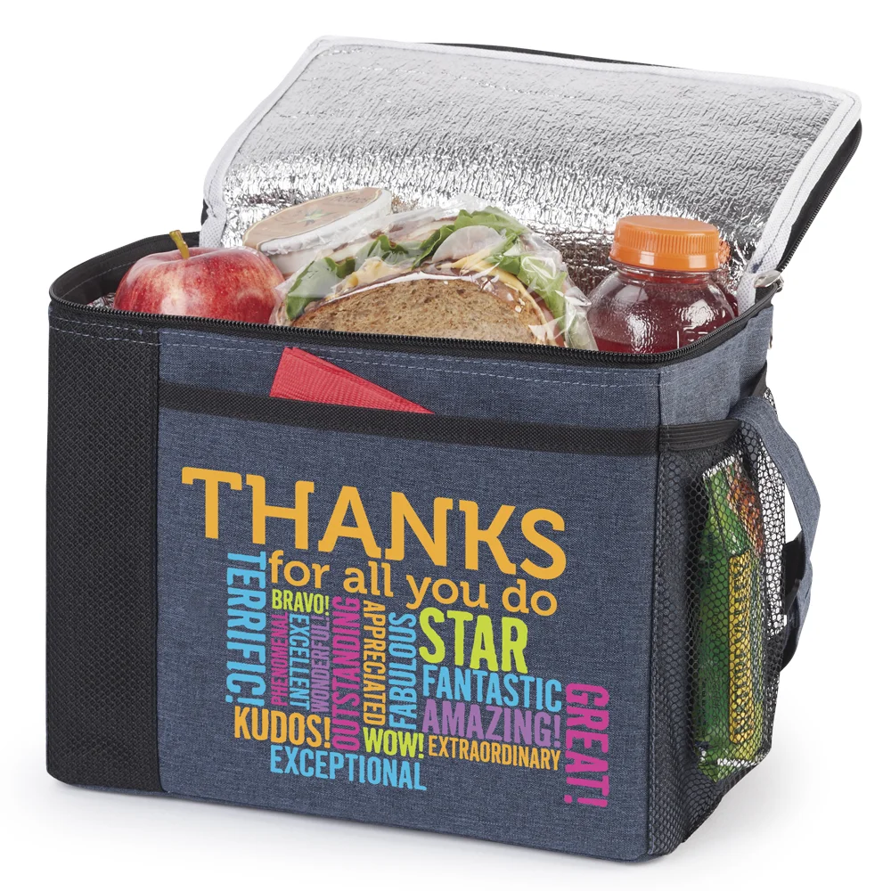 Grayson Lunch/Cooler Bag: Flip-top lid with zip-around closure; 2 zipper pulls; Large compartment; Front slip pocket; Side mesh pocket; Insulated lining is easy to wipe clean; Adjustable strap; ID window on back; Holds up to 8 cans; Heathered 300-denier polyester with contrast trim