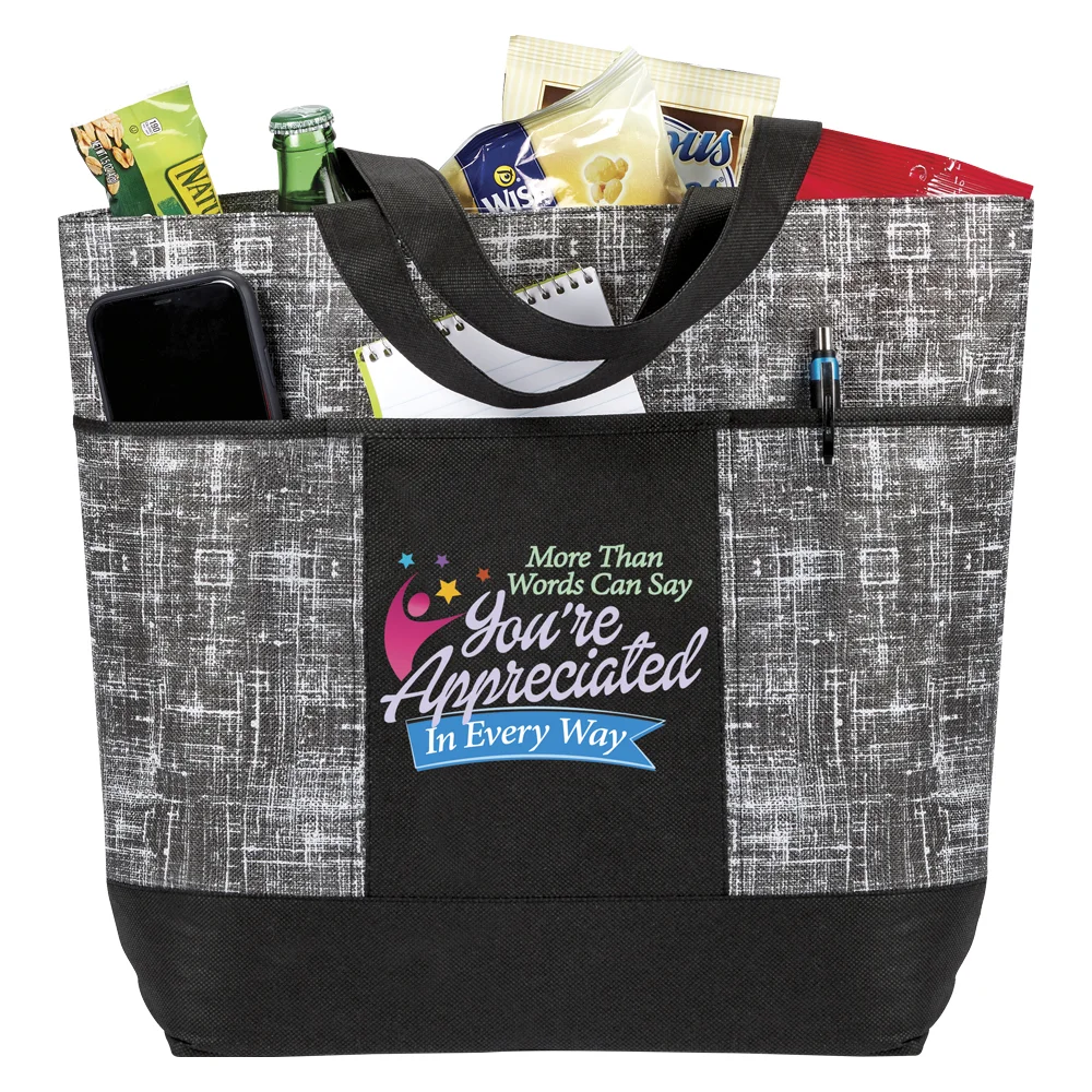 Malibu Non-Woven Tote Bag: Distressed "denim" look and solid accents; Reusable; Open top with 5" bottom gusset; Three front pockets; Reinforced shoulder straps: Color coordinated dual 25 1/4" carry handles; Non-woven polypropylene is eco friendly and recyclable