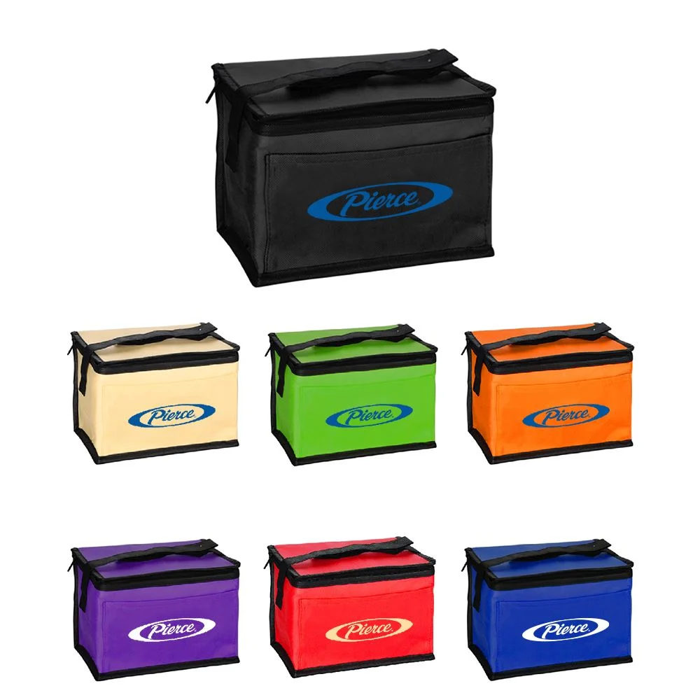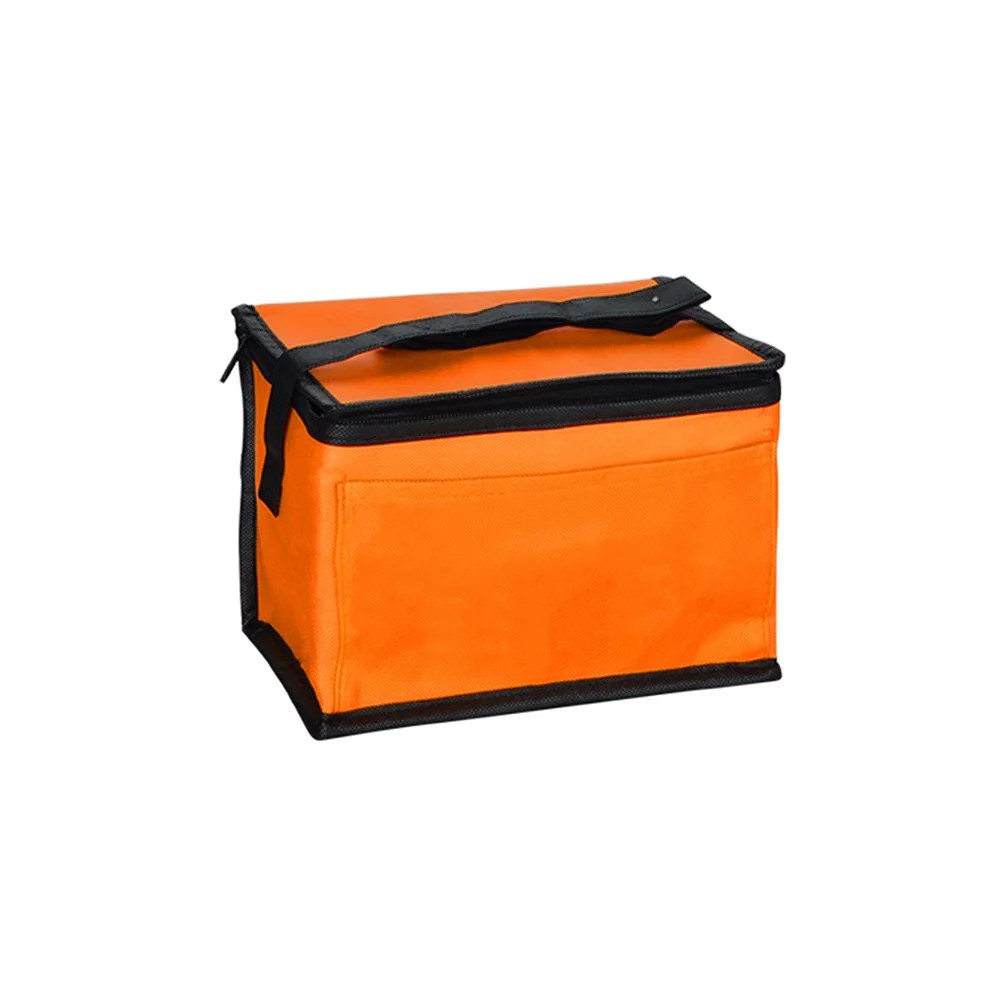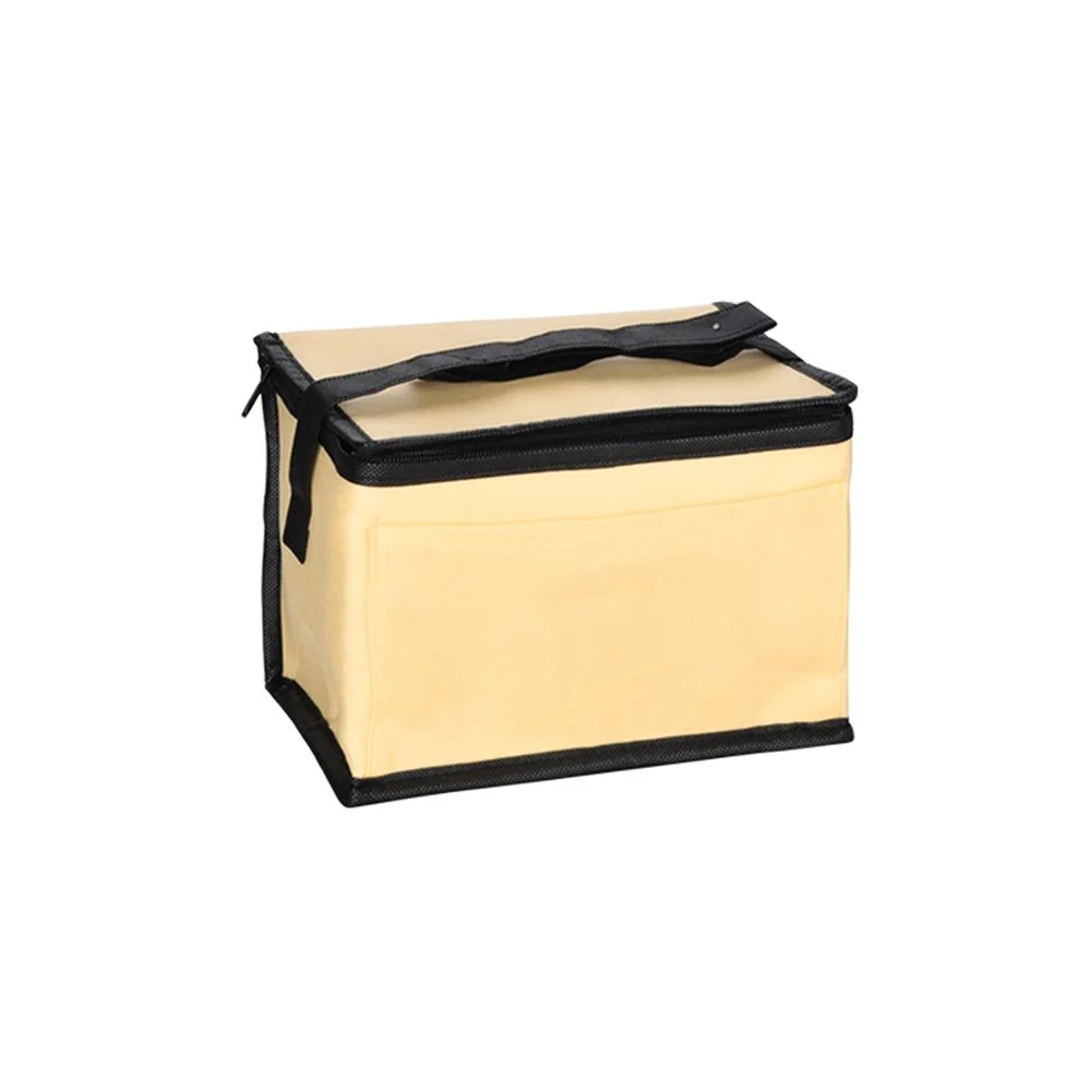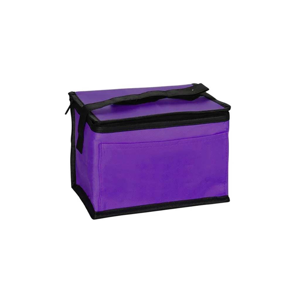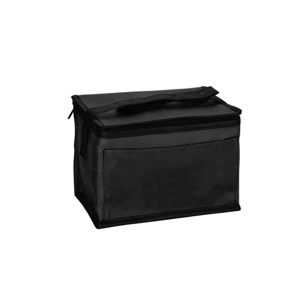 Non-Woven, 80-gram cooler bag has water-resistant polypropylene coating, is PEVA insulation lined, has a front pocket, and is zippered