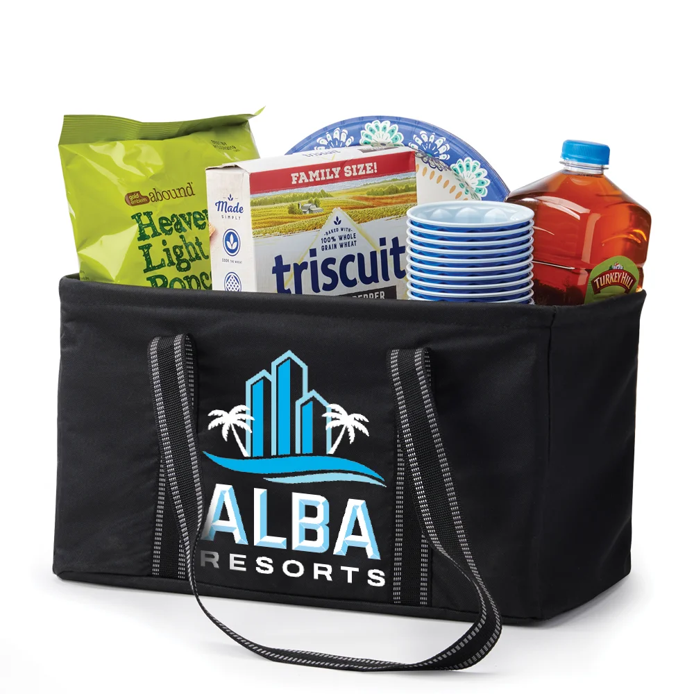 Personalized Tote: Large main compartment with wire rim to hold its shape; Collapses flat for easy storage; Stable base makes it easy to load and unload; Carries groceries, clothing, and daily essentials; Dual 33.5" black web carry handles; 600-denier polyester