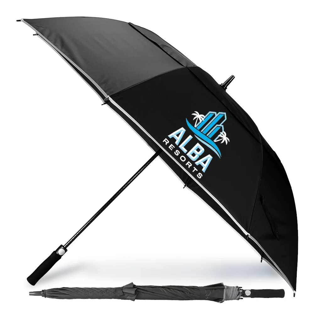 Personalized 60" Umbrella: Huge, double-canopy arc made of pongee fabric with 8 panels offers exceptional coverage, wind resistance, & UV protection; Coated-metal frame with fiberglass ribs and shaft keeps canopy from flipping inside out; Reflective trim for optimal visibility; Soft, EVA handle with simple one-touch, auto-open button