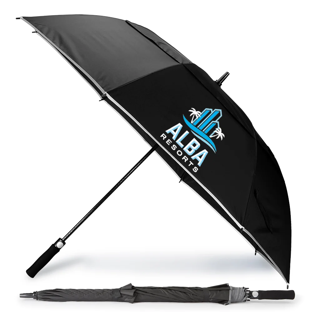 Personalized 60" Umbrella: Huge, double-canopy arc made of pongee fabric with 8 panels offers exceptional coverage, wind resistance, & UV protection; Coated-metal frame with fiberglass ribs and shaft keeps canopy from flipping inside out; Reflective trim for optimal visibility; Soft, EVA handle with simple one-touch, auto-open button