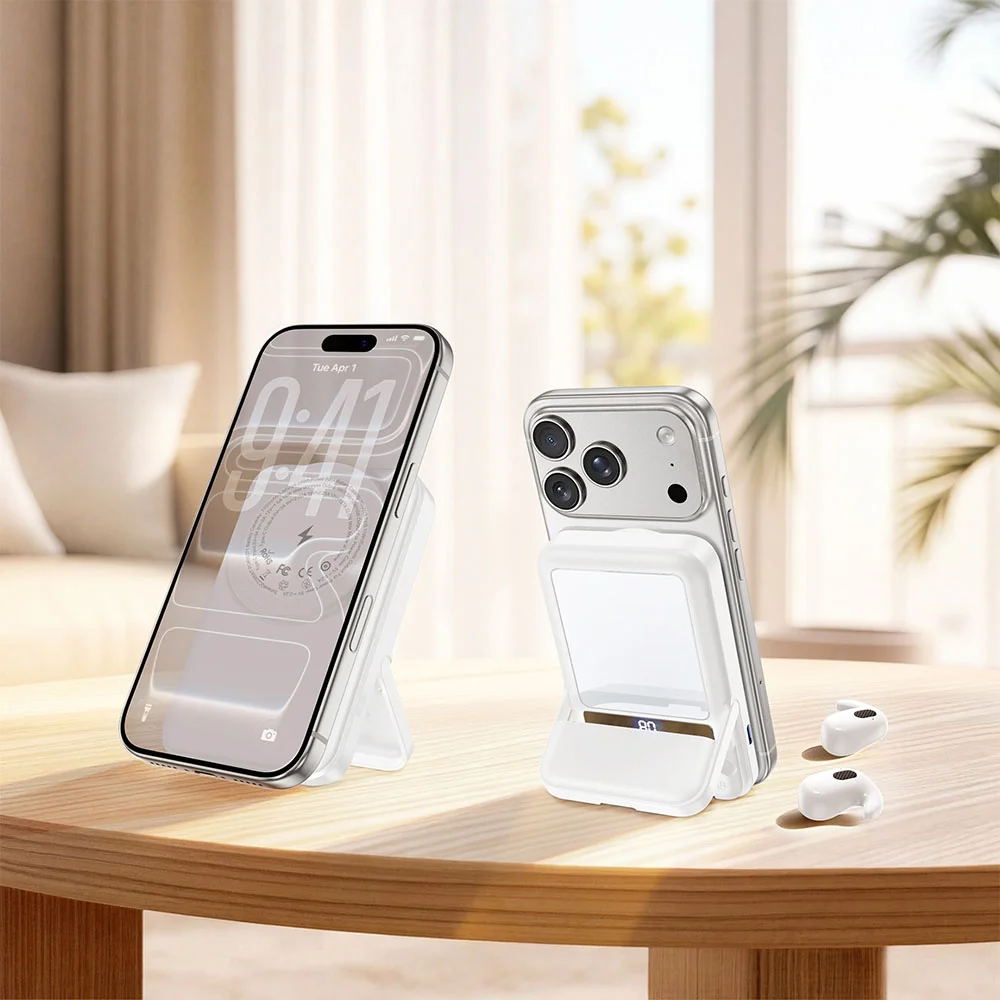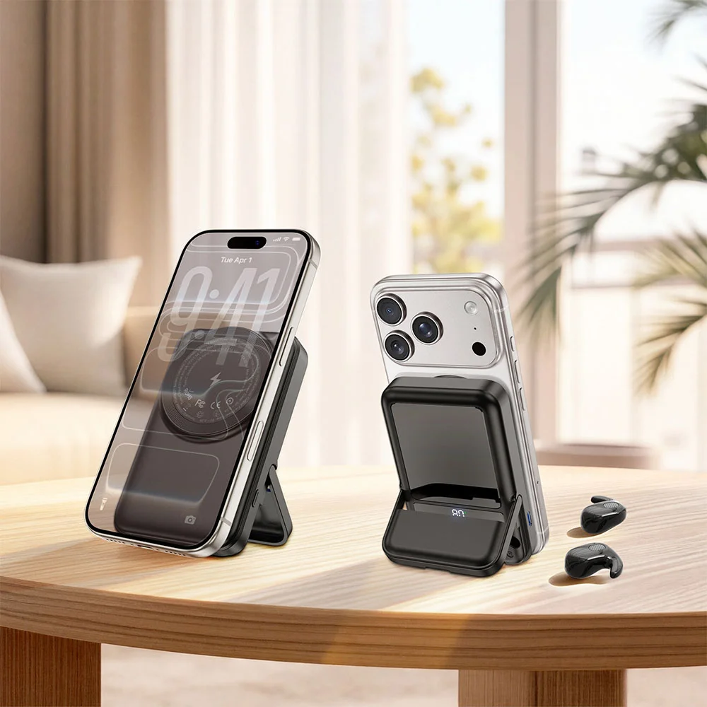 Delivering up to 22.5W output through its Type-C port and up to 15W via wireless charging, it keeps your devices powered quickly and efficiently, while the integrated folding stand doubles as a protective cover that reveals built-in storage for Bluetooth sleep-ergonomic earphones