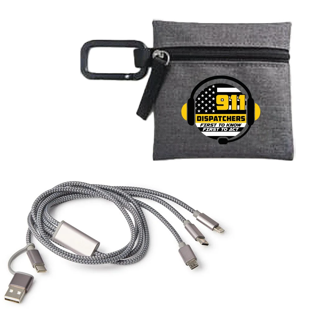 5-in-1 4-ft. Braided Charging Cable Cord With Mini Zip Pouch: Durable, no-tangle braided 4-foot charging cable; Compatible with many devices; Five aluminum connectors: USB A and Type C on one end, Lightning, Micro USB, and Type C on the other; Mini zip pouch included; Carabiner attached