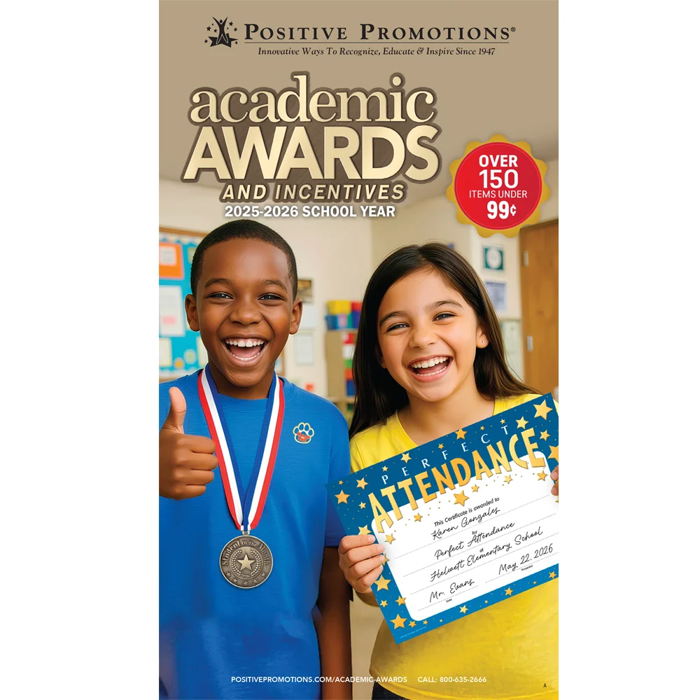 Celebrate students' achievements all year long! Stock up on unique, budget-friendly awards and prizes featuring Positive Promotions' exclusive, encouraging designs that will fill your students with the ultimate sense of pride and accomplishment. Our collection includes all types of academic awards from engraved plaques and medallions to colorful tags and pencils that reward good behavior, top marks, perfect attendance, and so much more!