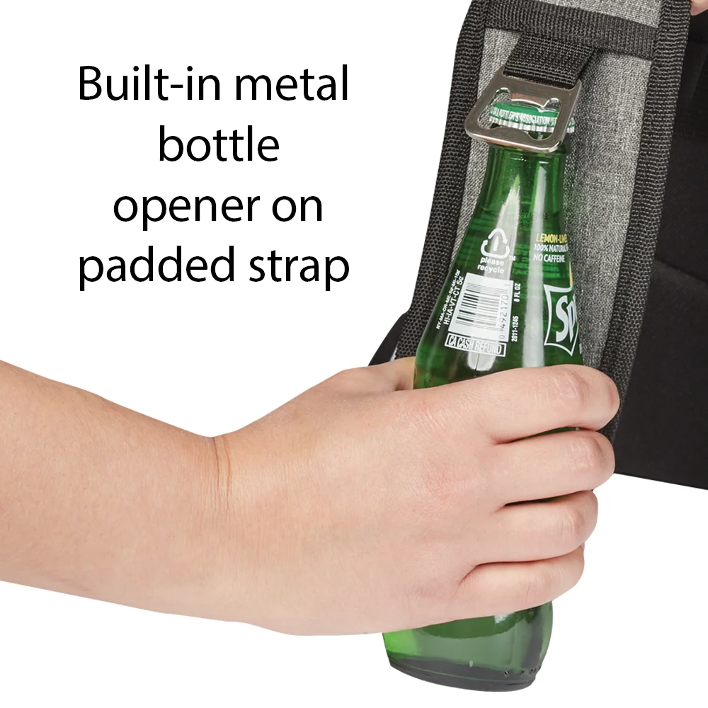 • Front slip pocket, 2 side mesh pockets; attached bottle opener