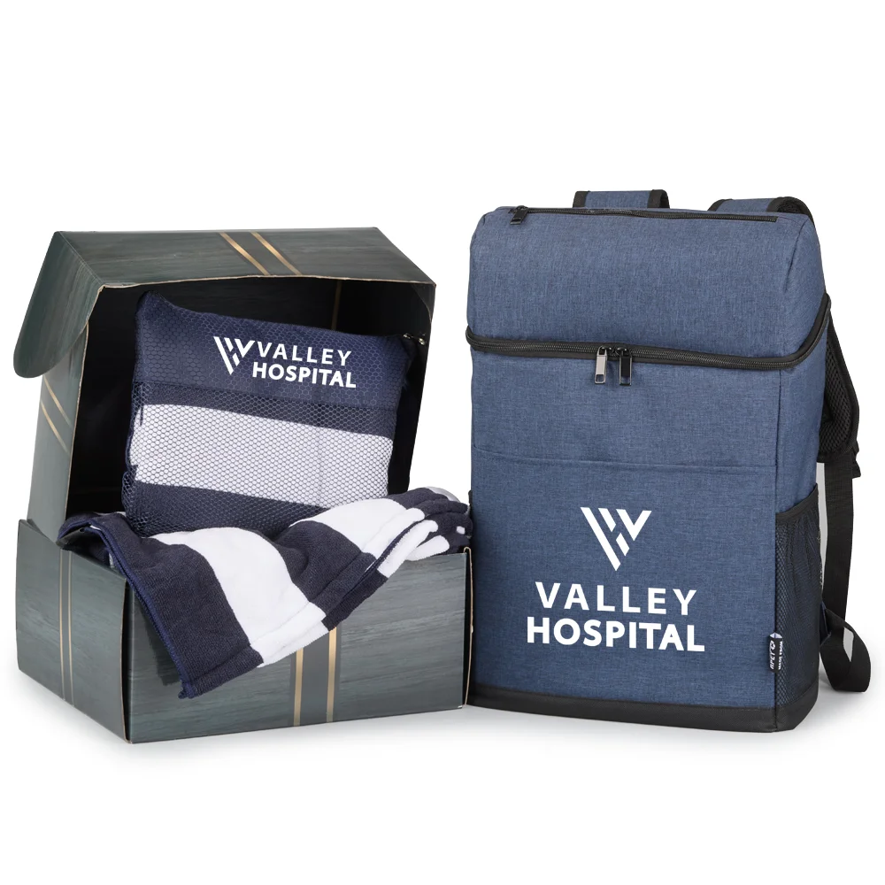 2-piece gift set includes: Adventure rPET 20-Can Backpack Cooler With Trolley Strap & Beach Towel in Mesh Carry Bag - plus a free Appreciation Card