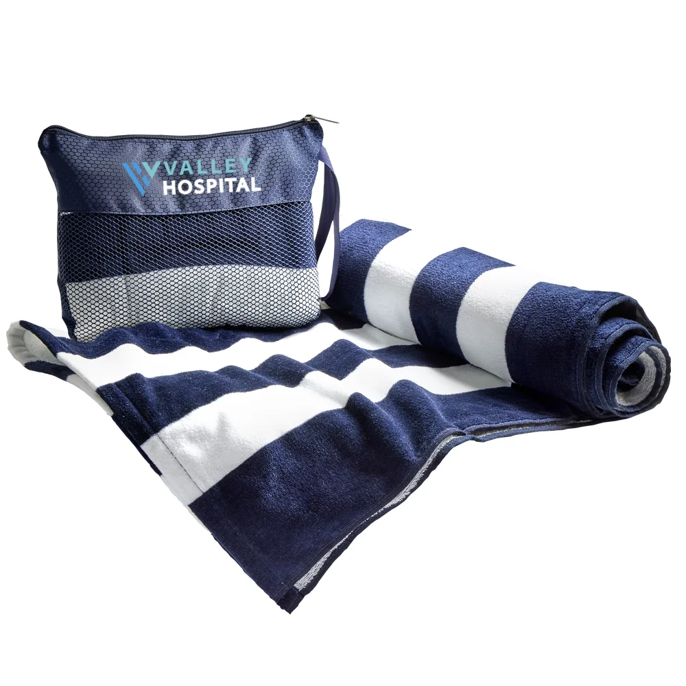 Personalized Towel in Carry Bag: Striped, soft, highly-absorbent, quick-drying 100% microfiber towel; Machine washable; Rip-stop nylon/mesh, zip-shut carry bag for storage and travel; Wrist strap for convenient carry; Both towel & mesh storage bag resist and release sand with ease; Bag also keeps phone, wallet, keys, and valuables secure outdoors; Towel measures 30" x 60" unfolded