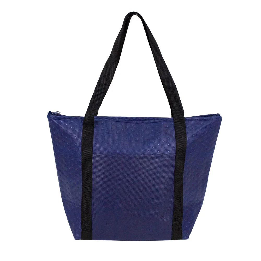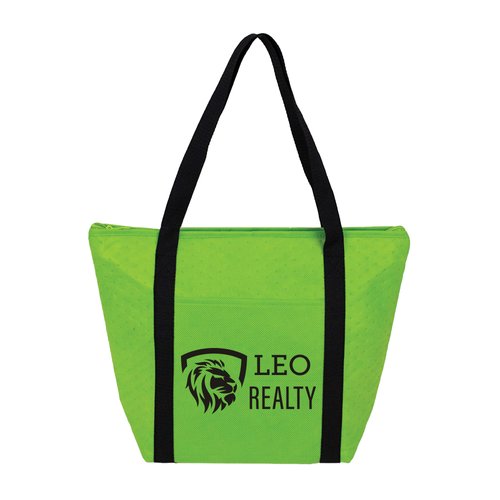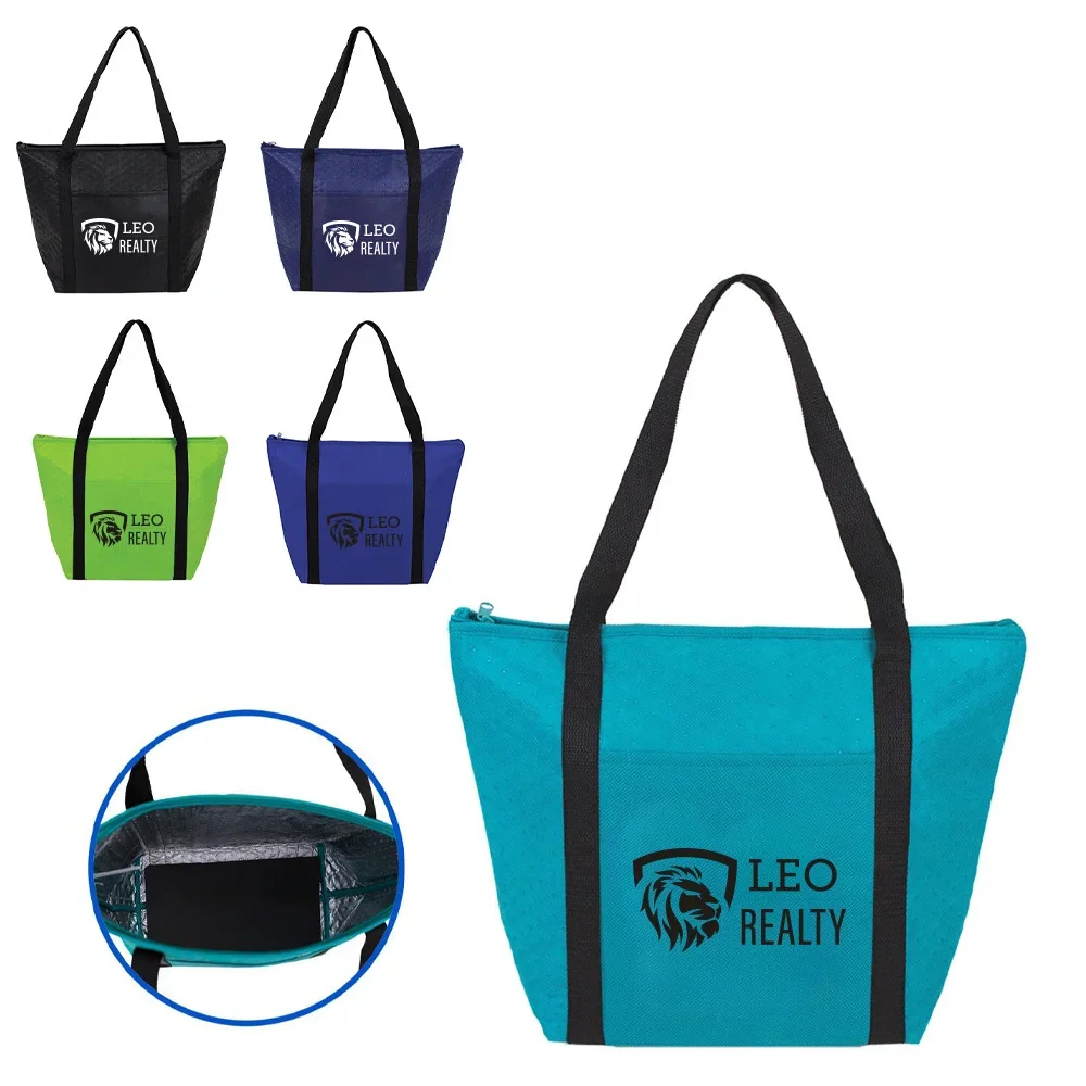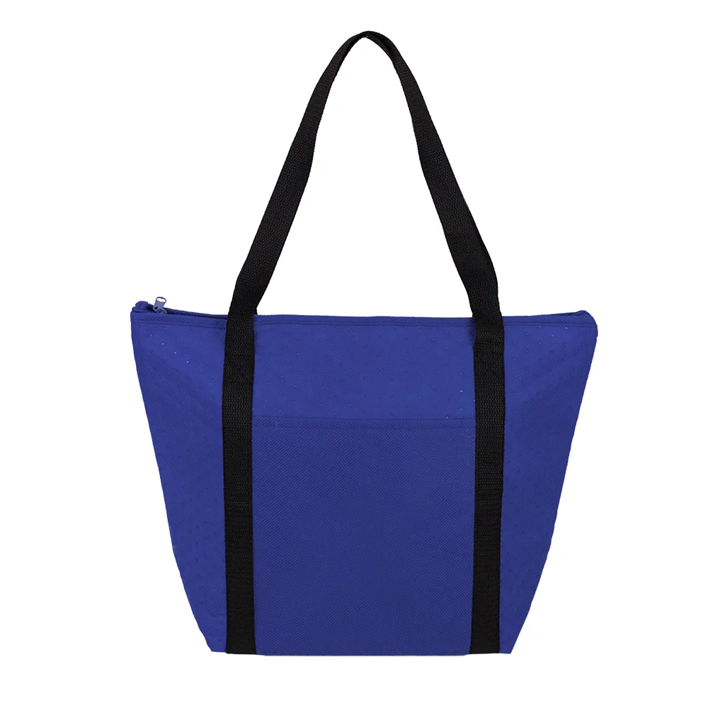 * Hot/cold cooler tote with foil lining to keep food insulated & front open pocket. Includes drop-in board for support. Comes in 6 fabric colors with black handles. Imprint on front pocket only.