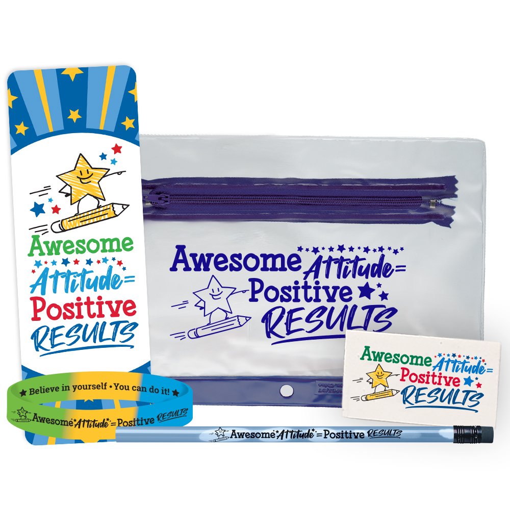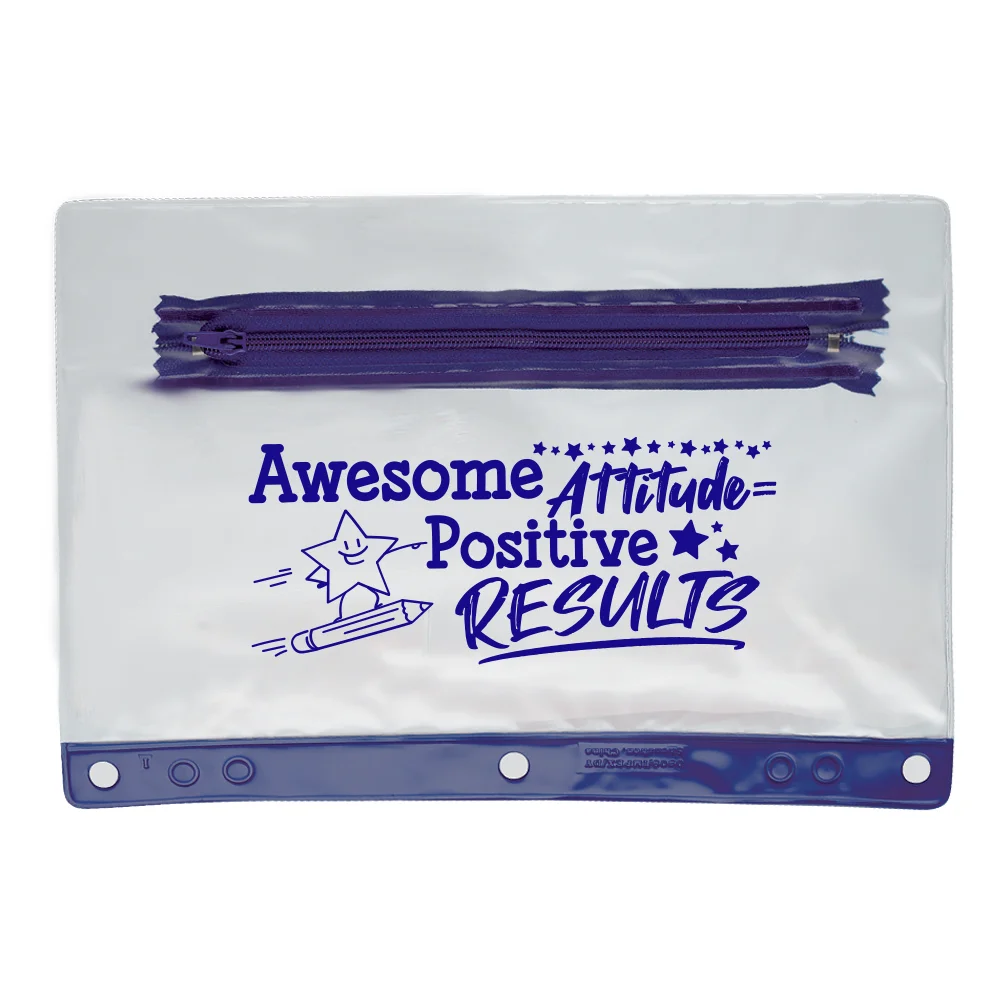 Vinyl pencil pouch can be inserted into a three-ring binder and comes complete with four additional items