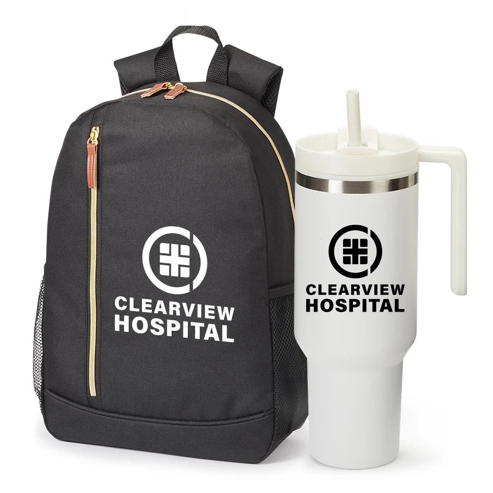 2-piece gift set includes: Axel 15" Laptop Backpack & Quencher Stainless-Steel/Plastic-Lined Tumbler 40 oz. With Handle