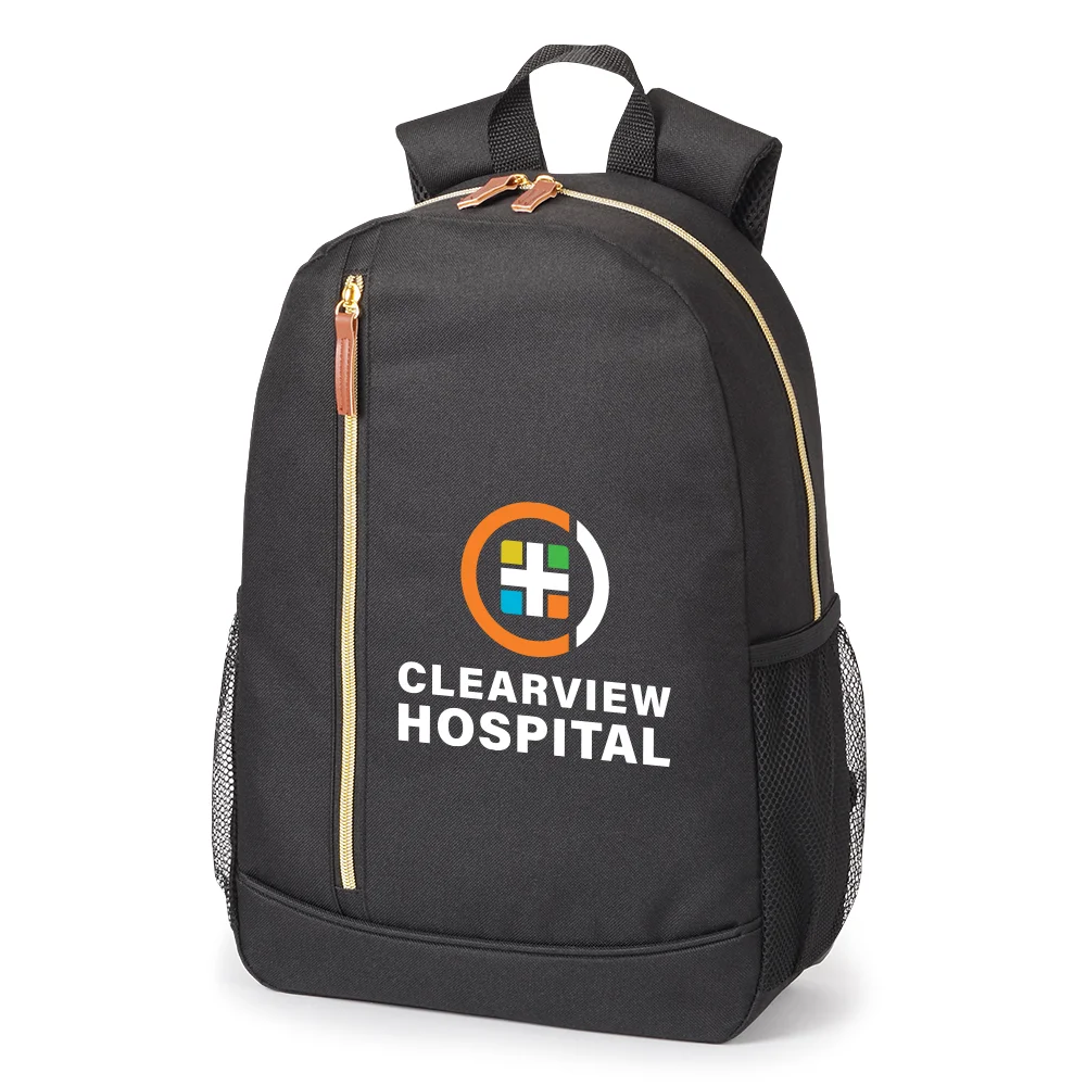Personalized Backpack: Roomy main compartment with double-zip access; Interior padded laptop sleeve fits most laptops up to 15"; Vertical zip front pocket totes a tablet; Front or side entry to access belongings quickly; Mesh pocket on each side for water bottles, umbrellas, & more; Refined details: gold-trimmed zippers and tan leatherette pulls; Back panel and adjustable straps cushioned for all-day comfort; Top loop for quick grab and go; Trolley strap on back slips over luggage handles for travel ease; 600-denier polycanvas
