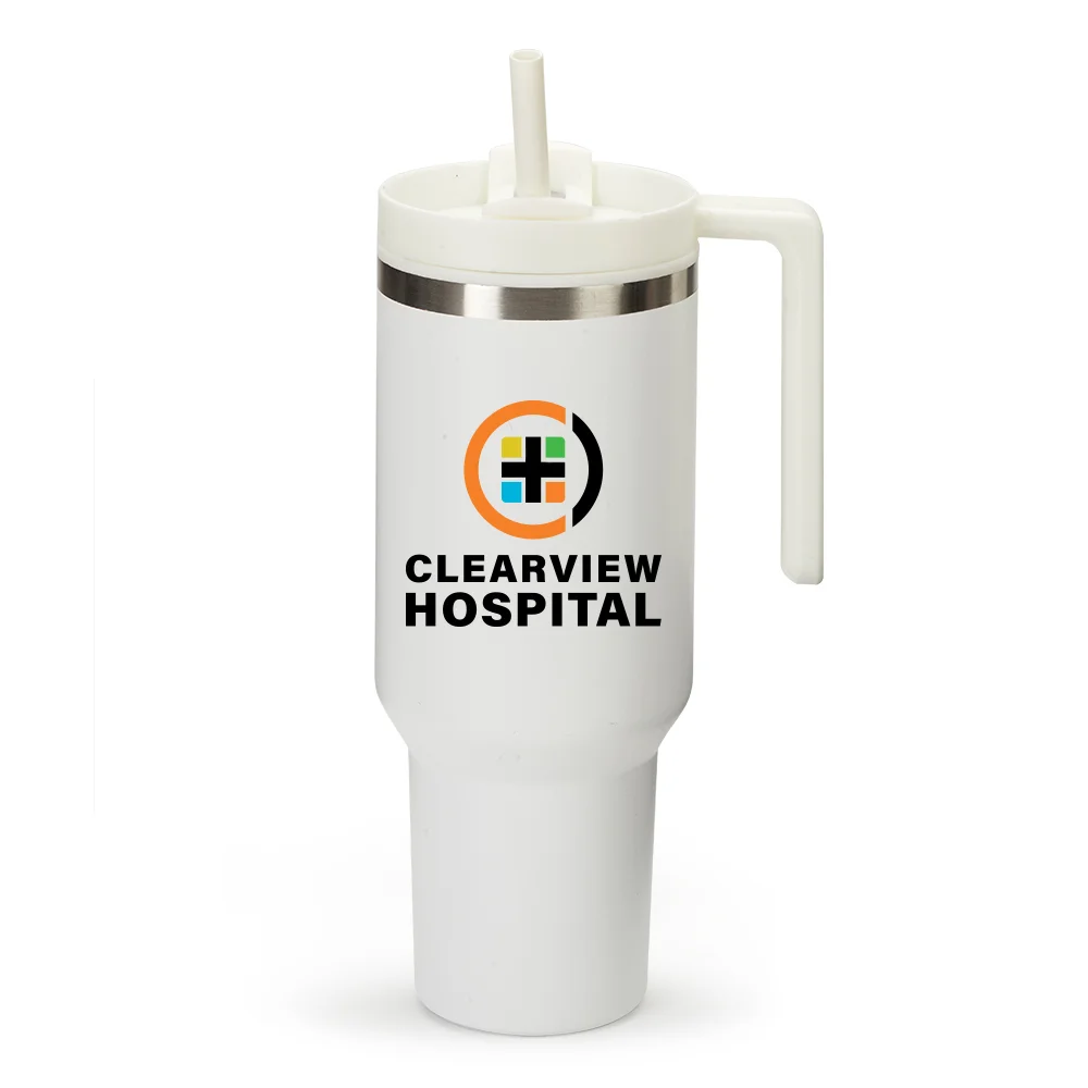 Personalized 40-oz. Tumbler: Double-wall insulated tumbler: stainless-steel outer and plastic liner; Maintains optimal hot or cold temperature; Splash-proof, threaded, 3-position rotating lid: Straw opening with included reusable straw, drink opening, & fully sealed; Sturdy handle for a sure grip; Tapered base fits most car cup holders; Eco friendly; Reusable; BPA free; Note: Tumbler: Hand-wash only; Straw: Dishwasher safe