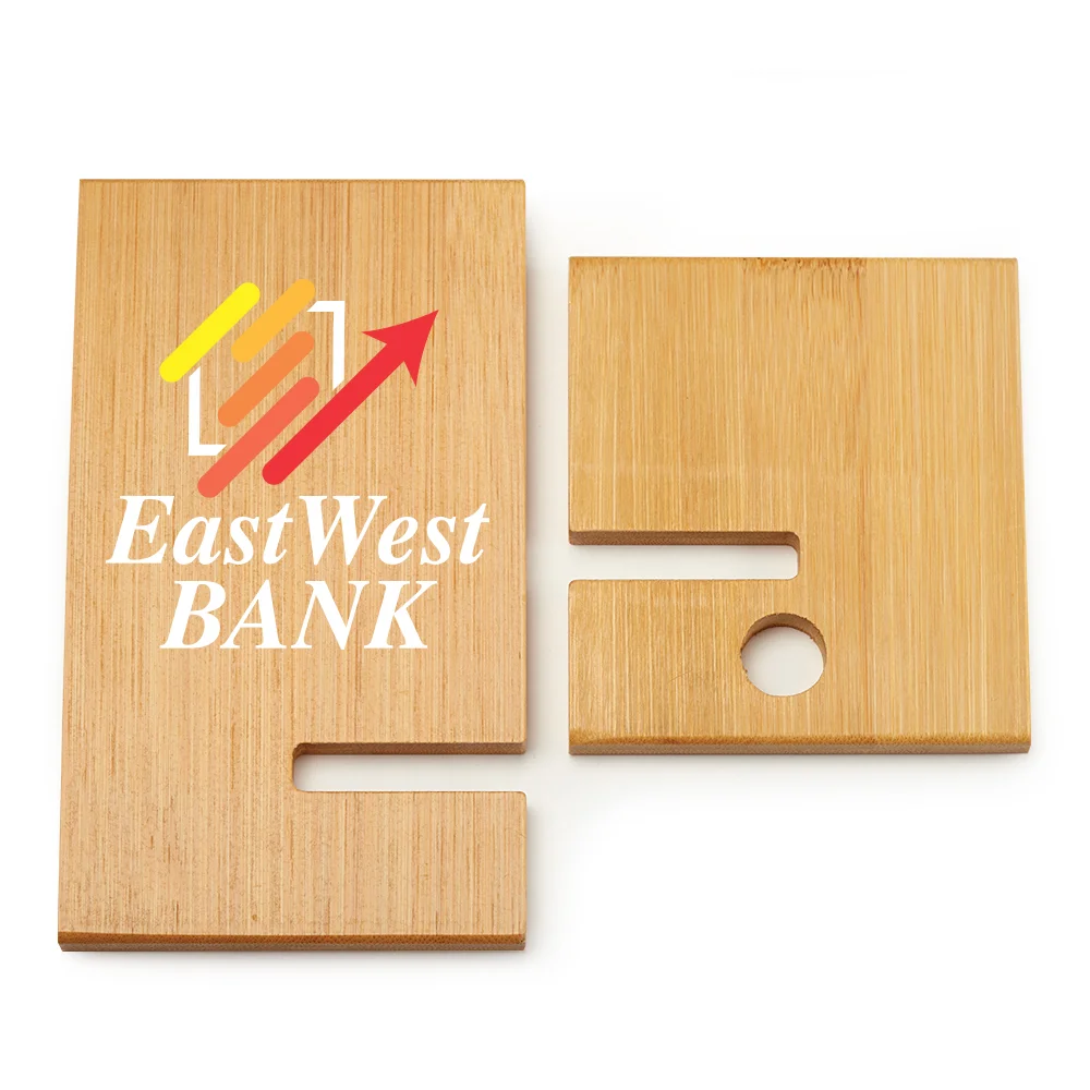 Personalized Phone/Tablet Holder: Sturdy, lightweight, & versatile; Holds tablet, phone, or other device; Find the perfect viewing angle vertically or horizontally; Made from natural, eco-friendly, renewable bamboo; Slot in base lets phone charge while still in use; Easy-to-assemble, two-piece design; Ships flat; Included card explains the eco-friendly benefits of bamboo on front; Assembly instructions on back; Gift box included