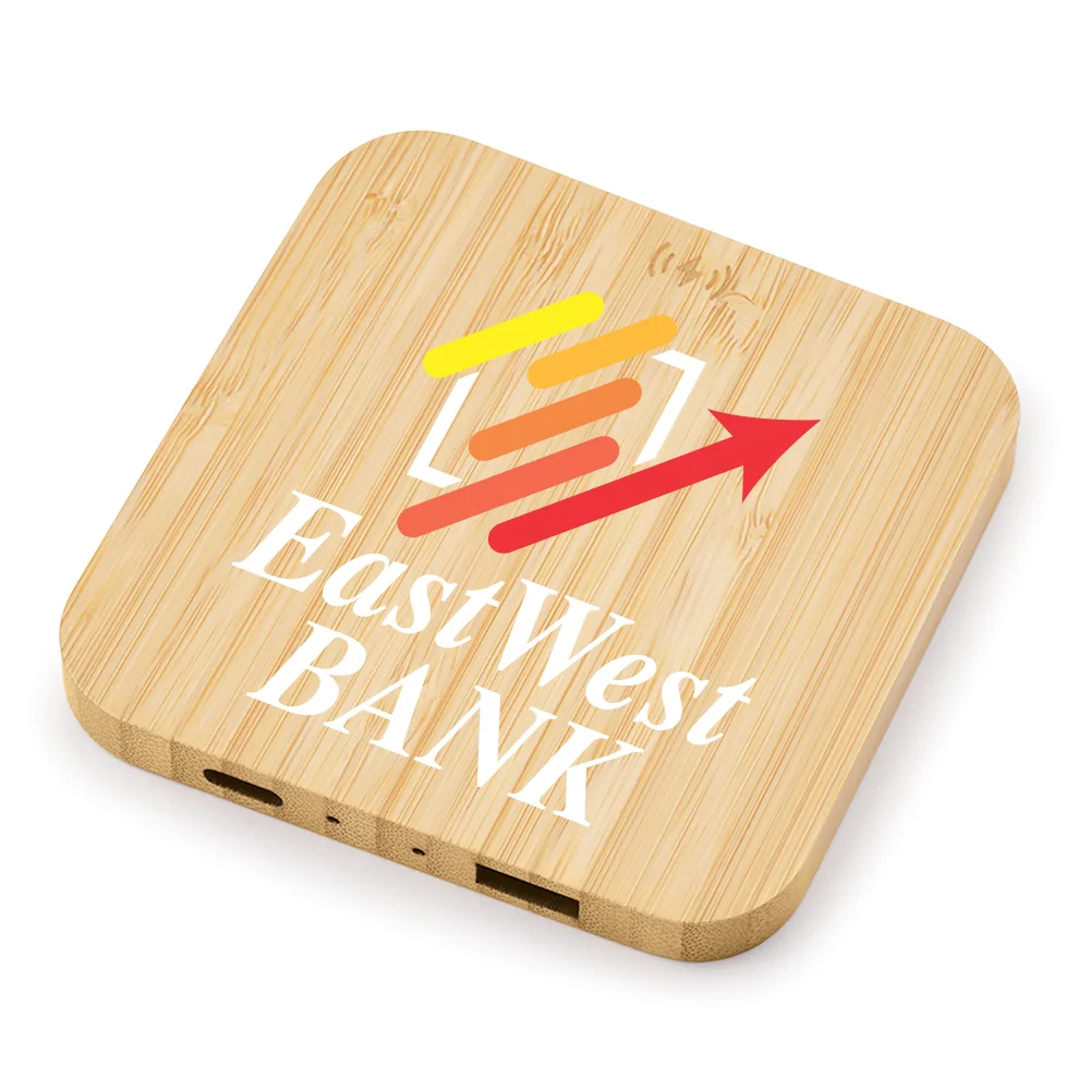 Personalized Charging Pad: Made of natural bamboo, an eco-friendly, sustainable, renewable resource; Place smartphone or other compatible device on fast 10W charging pad for wireless charging; Two additional ports (Type-C and USB-A) to charge 2 additional devices; 4-ft. Type-C-to-USB-A cable included; Must be plugged into a USB 9V (fast-charging) wall adapter to power the pad