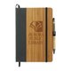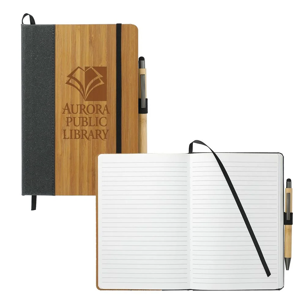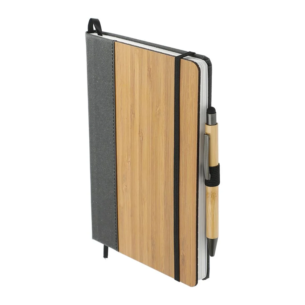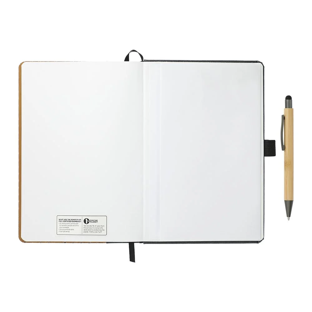• Journalbook: Unique FSC®-certified bamboo cover with recycled leather accent; 80 sheets of recycled, white, lined paper; Elastic closure, ribbon page marker, and elastic pen loop