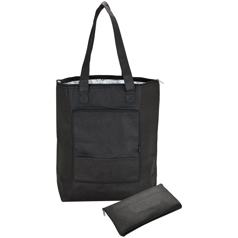 Foil insulated grocery shopper with zippered closure, outer pocket and 24" handles, folds down to easy 9" x 4 5/8" carry size
