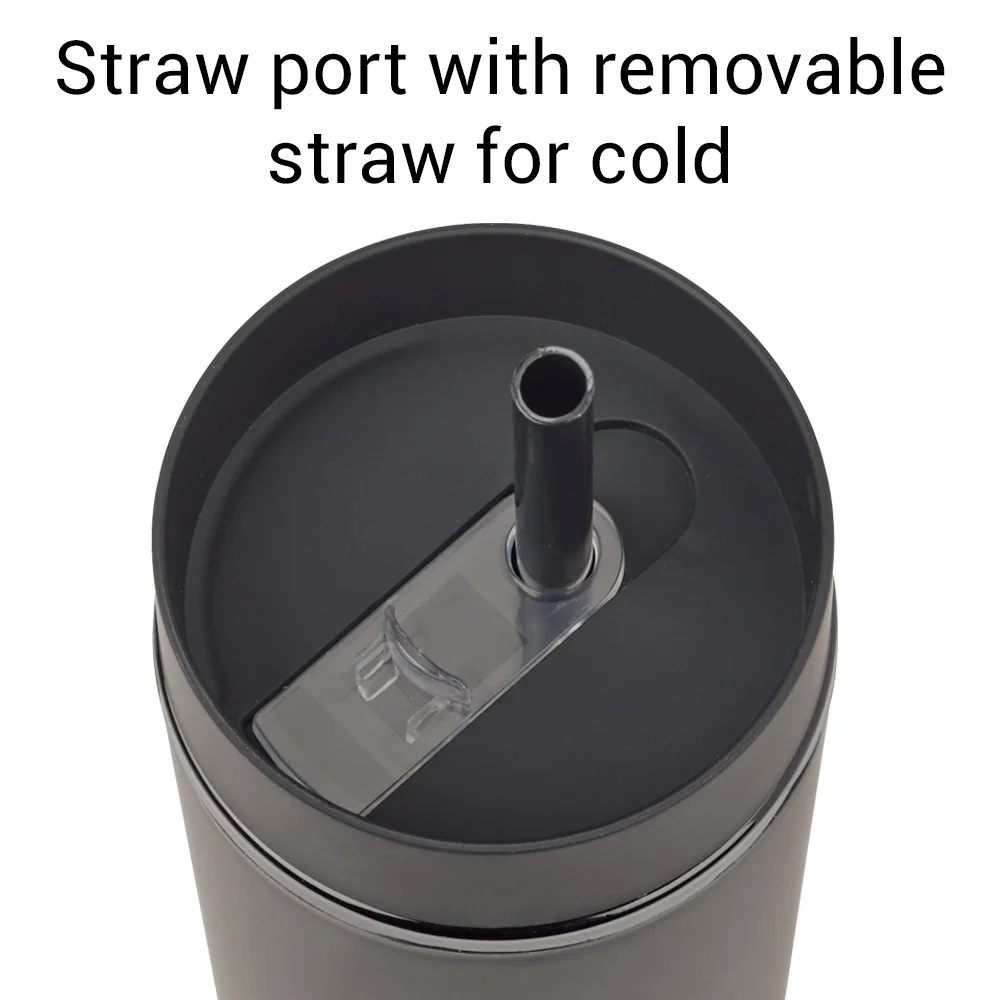 • Straw port opening for cold drinks; Reusable soft straw included; Slips through straw port; Stopper on end prevents spills and keeps it in place