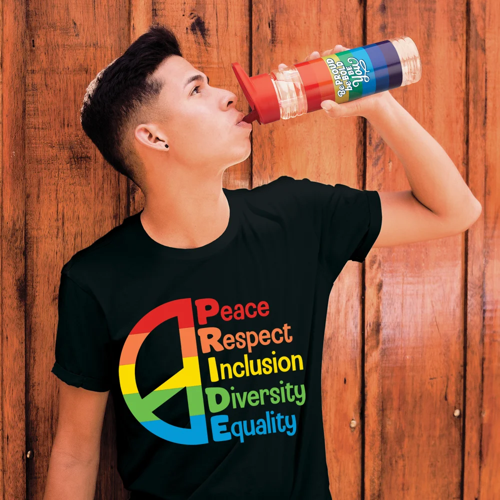 • Wraparound rainbow design features our exclusive Be Proud. Be Bold. Be You. slogan on front; Hydration reminders on back
