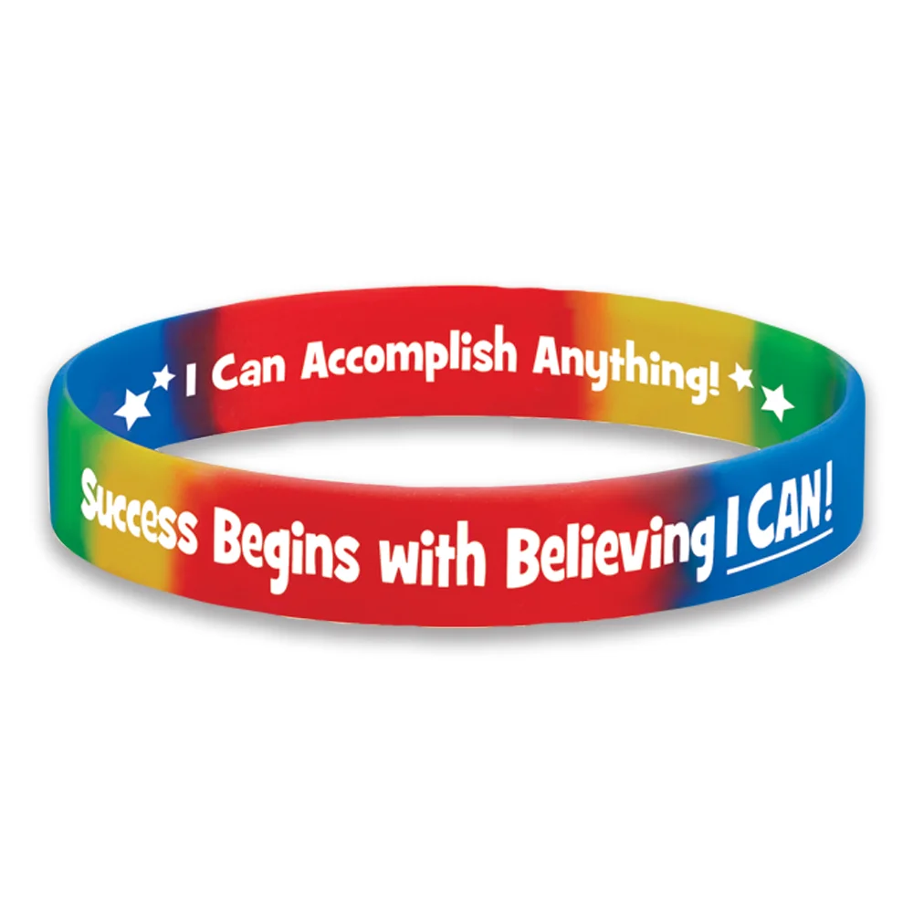 30 Success Begins With Believing I Can! 2-Sided Silicone Bracelets: Bracelet in dazzling rainbow colors features a message outside and inside that encourages children to believe in their abilities and to learn and grow; Great way to inspire students to accomplish anything they can; One size fits all; lead-free, PVC-free and latex-free silicone; FDA compliant