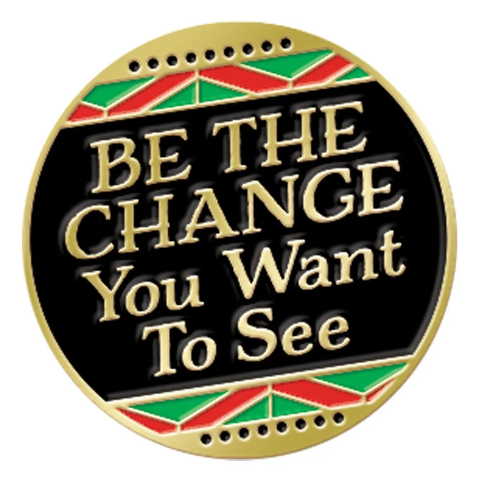 Metal pin with glossy enamel finish features our exclusive, colorful Be The Change You Want To See design