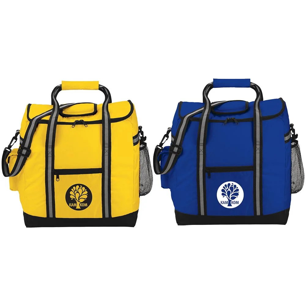 The Beach Side Deluxe 36-Can Event Cooler features PEVA insulation a zippered main compartment and front pocket a side mesh pocket a side pocket with a hook and loop closure and double 19" reinforced carry handles