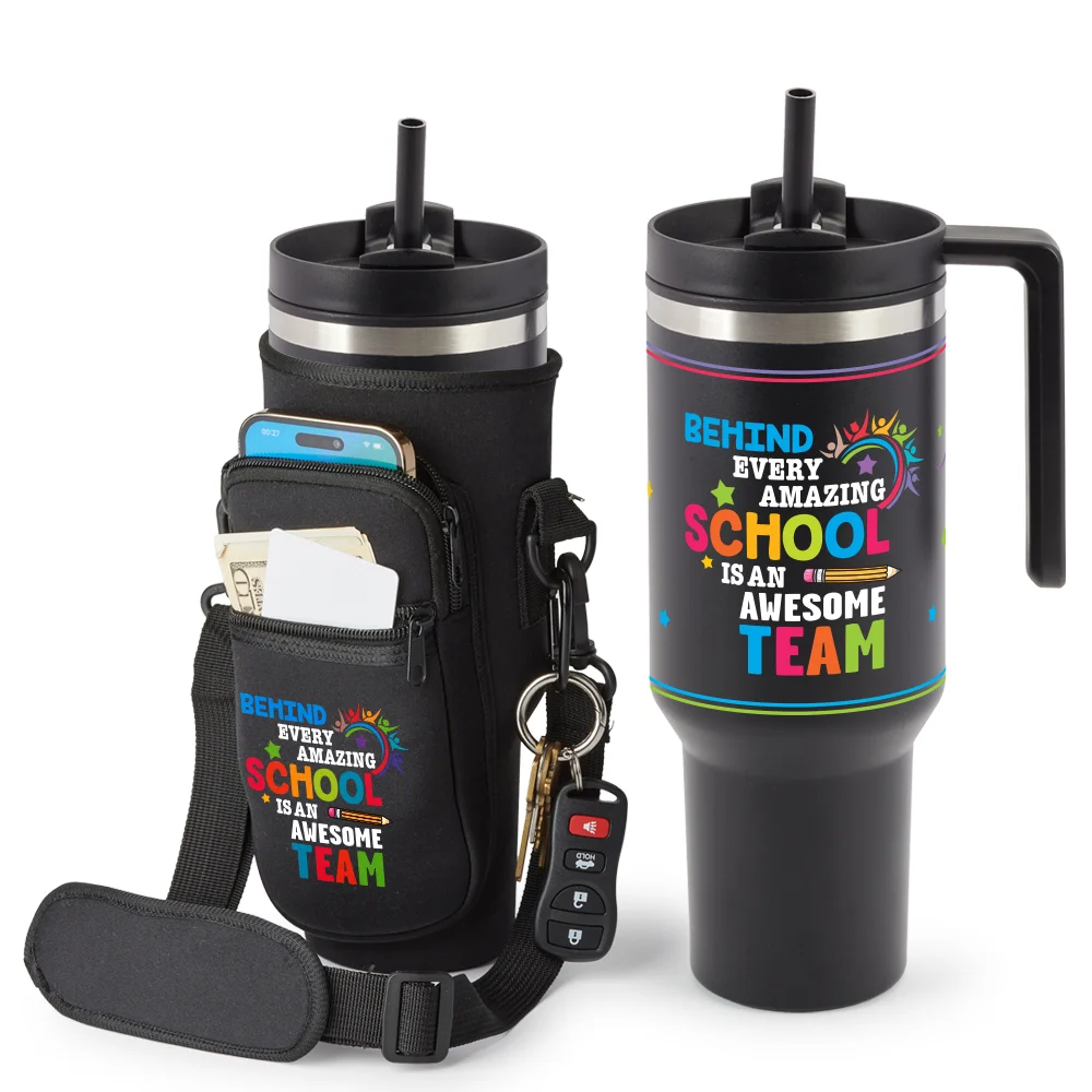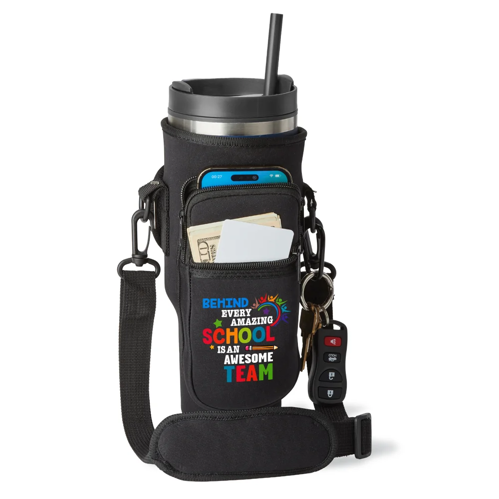 Tumbler Bag: Quality neoprene with Velcro® closure holds a standard 40-oz. tumbler, with or without handle; Neoprene keeps hot or cold beverage at optimal temperature longer while protecting tumbler; 2 zippered pockets for a smartphone, cash, IDs, and more; Padded, adjustable, detachable shoulder strap for carrying over the shoulder or across the body; Carabiner clip for attaching keys