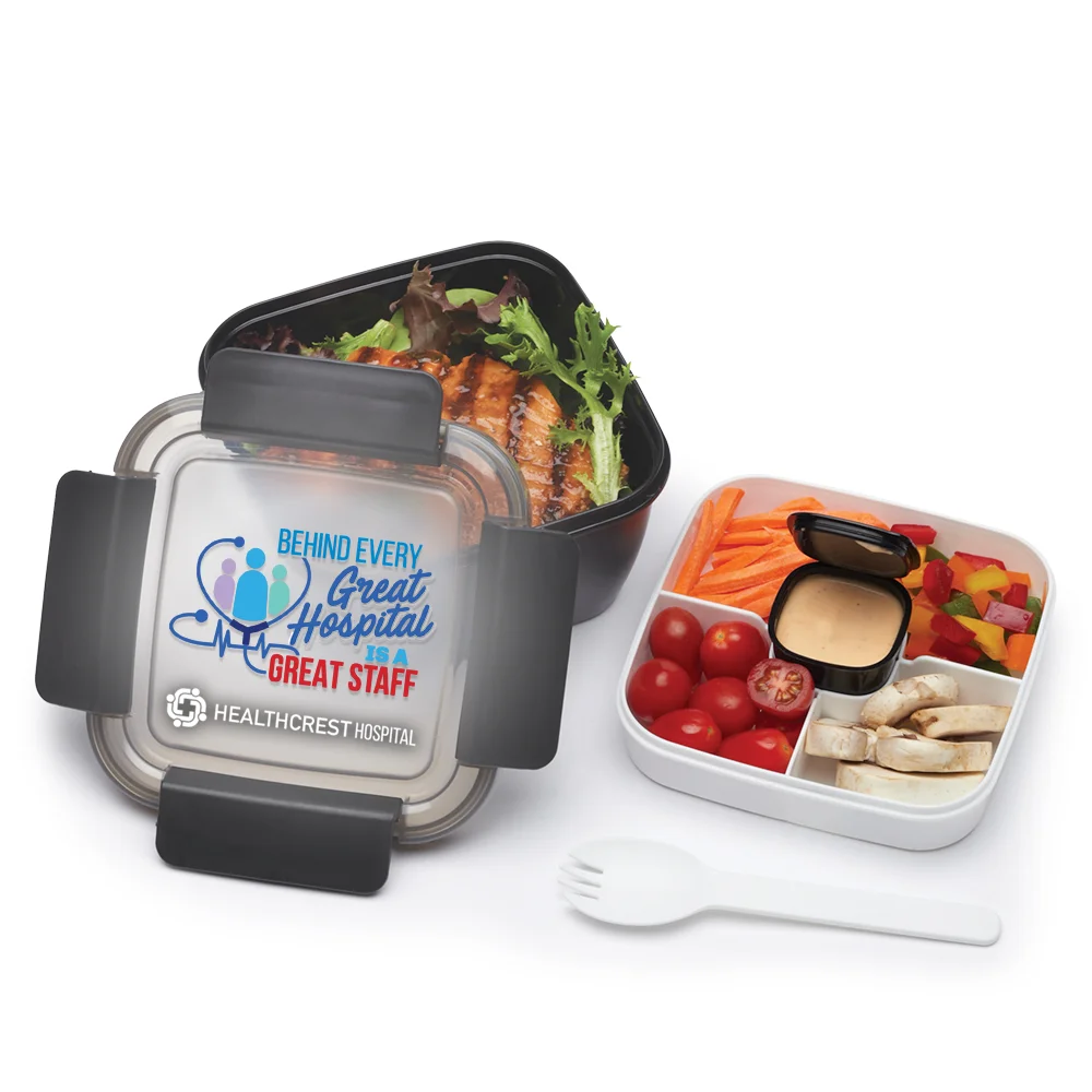 Personalized Food Container: Travel-friendly food container keeps entire meal fresh and organized; Plastic and silicone construction with hinged locking tabs creates an airtight, spill-resistant lid; Entree-sized bottom compartment holds 54 oz. (6.75 cups); Multi-compartment tray separates fruits, veggies, and sides; Sits on top of large compartment; Removable, lidded container in center holds 3 oz. of toppings, dips, or dressing; Included reusable fork tucks neatly inside; Eco friendly; BPA free; Note: Freezer, microwave, and dishwasher safe