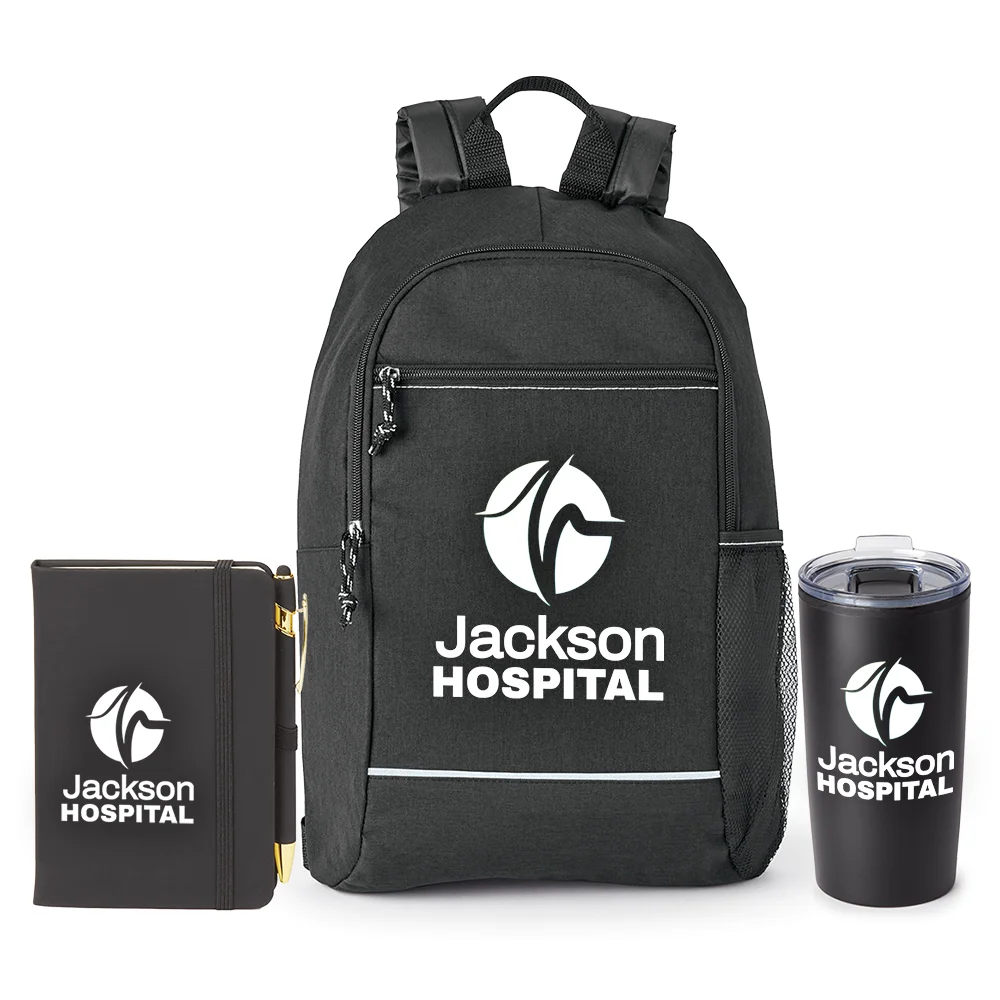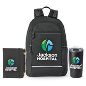 3-piece set includes: Bayside Backpack with Reflective Trim, Stanton Jotter with Sticky Notes & Stylus Pen, & Teton Stainless-Steel Tumbler 20 oz.