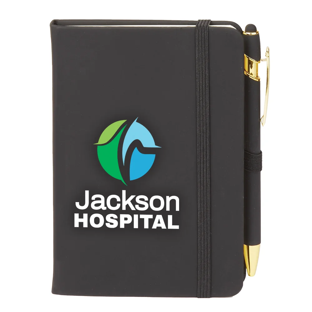 Jotter, Notes, & Pen Set: Padded, soft-touch, leather-like, hard-cover jotter; 80 lined pages for all your note-taking needs; Inside cover holds two 2.75" x 1.25" sticky pads and five 1.75" x 1.5" neon sticky flag pads (25 each of 5 colors - 125 flags total!); Ribbon page marker keeps your place; Elastic strap closure keeps everything secure; Elastic pen loop holds the included metal stylus pen with smooth, rubberized finish and gold accents; Black ink