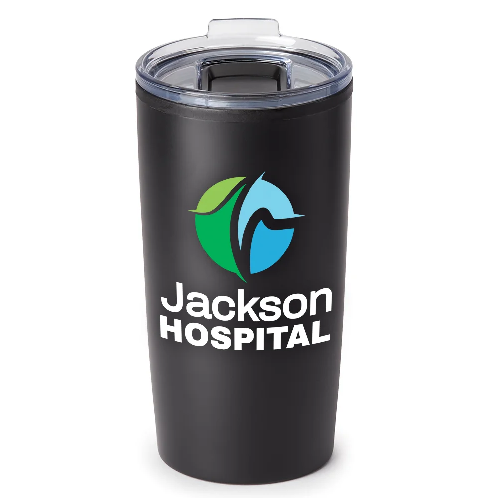 20-oz. Tumbler: Double-wall insulated: stainless-steel exterior with a polypropylene liner; Keeps drinks hot or cold for several hours; Snap-on, spill-resistant, thumb-slide lid with rubber gasket; Eco friendly; BPA free; Reusable; Holds 18 oz. with lid on, 20 oz. with lid removed; Note: Do not microwave; Hand wash recommended