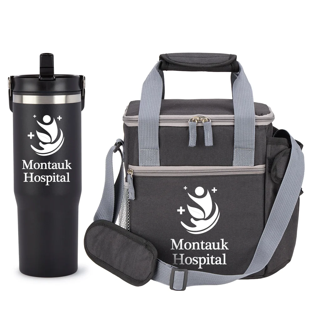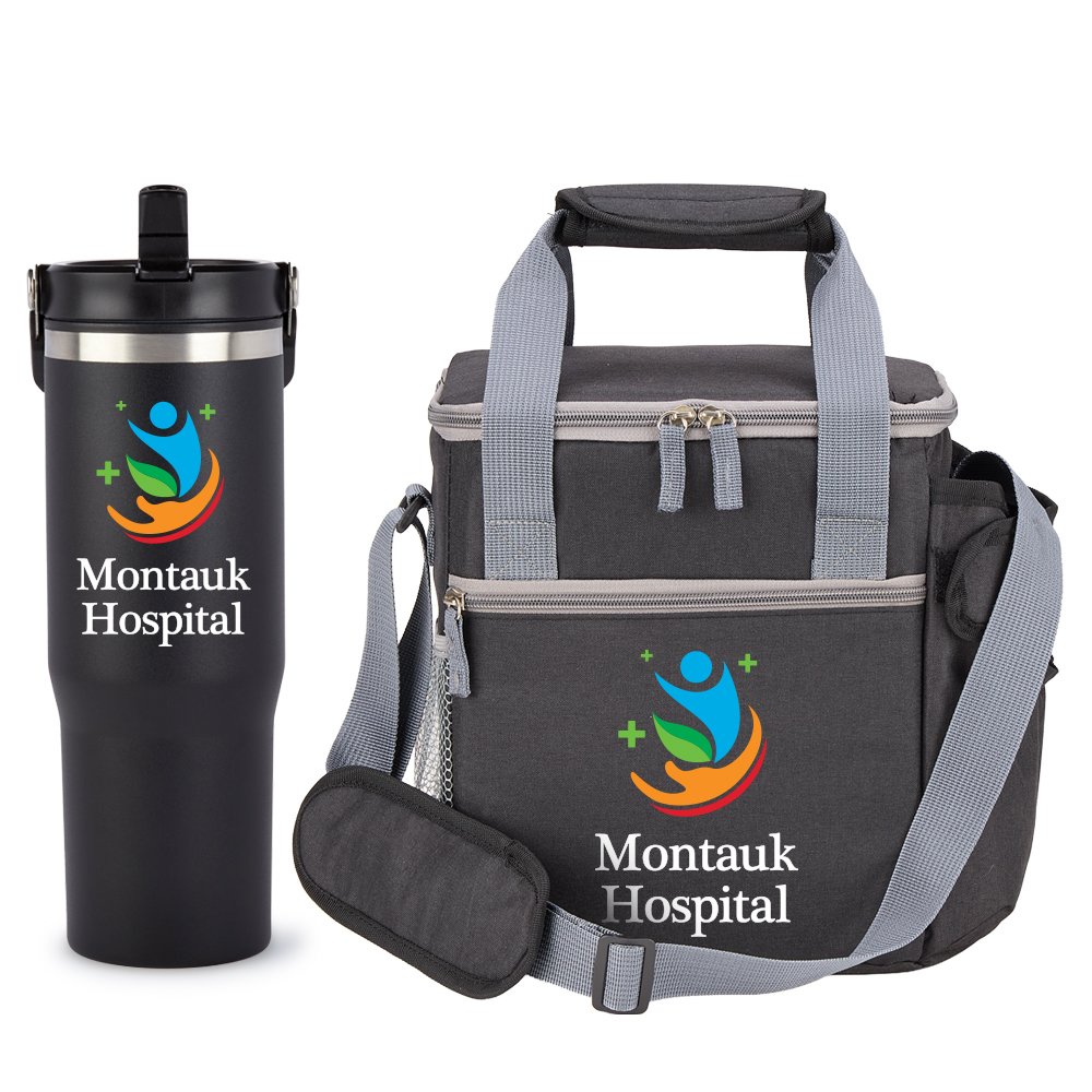 2-piece gift set includes: Coldflow Double-Wall Flip-Straw Bottle 30 oz. With Carry Handle & Riverside Deluxe Lunch/Cooler Bag With 30-/40-oz. Tumbler Pocket