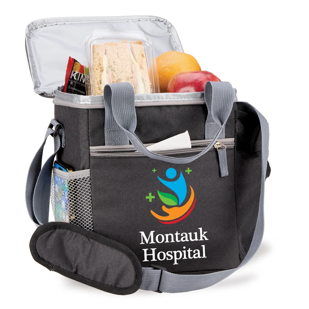 Personalized Lunch/Cooler Bag: Dual-zip, insulated main compartment keeps contents colder (or warmer) longer; Mesh pocket inside lid; Front zip pocket stashes napkins and other items; Side mesh pocket for a water bottle, utensils, and more; Additional adjustable side pocket totes up to a 30-/40-oz. bottle or tumbler; Two carry options: comfort-wrapped handles or padded, adjustable shoulder strap; Holds up to 9 cans; ID window on back; Heathered 600-denier polyester